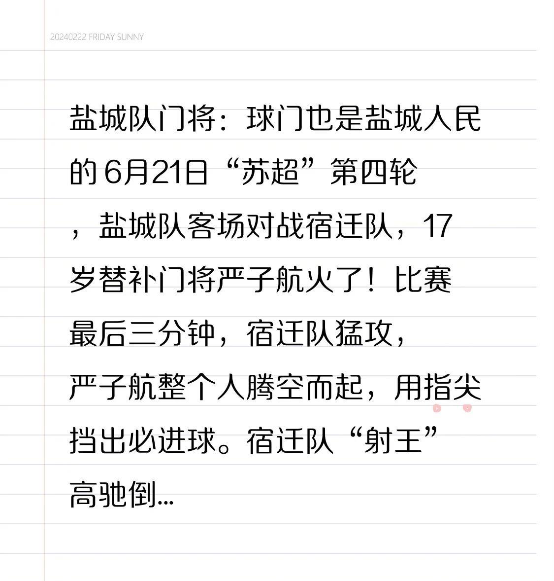 盐城队门将:球门也是盐城人民的 盐城队的门将严子航,那可是相当了不起。 在6月21日“苏超”的第四轮赛事里,盐城队客场去挑战宿迁队呢。这时候,17岁的替补门将严子航一下子就出了大名。 比赛到了最后三分钟,宿迁队发起了猛烈的进攻。只见严子航整个人高高地腾空而起,就用自己的指尖,把那眼看就要进的球给挡了出去。宿迁队有个“射王”叫高驰,他使出了倒挂金钩这一招,当时所有人都觉得这球肯定是要进的,可严子航飞身扑过去,一下子就扑到高驰的脚下,紧紧抱住了球。为了救这个球啊,他还被对方给踢伤了,抱着球在地上滚了三圈都没有松手呢。 比赛结束之后,他说的那句“我守护的球门,可不单单是盐城队的,更是盐城家乡父老的”,这句话可是感动了数不清的人。这小伙子才上高二呢,踢完比赛还得回学校去上晚自习。这样的“小盐哥”,真的是太招人喜爱了。 #苏超联赛盐城# #苏超宿迁队# #苏超门将#