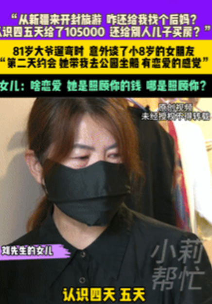“白嫖成功了?”一位81岁的新疆大爷,去开封旅游散心,岂料在遛弯时认识了一位73岁的女士,万万没想到,才四五天功夫,老爷子竟然一头扎进了“热恋”!更让人揪心的是,他转头就把攒了多年的105000元给了对方,还答应给人家儿子买房!女儿知道后急疯了,直喊:“啥恋爱 她是照顾你的钱 哪是照顾你?”