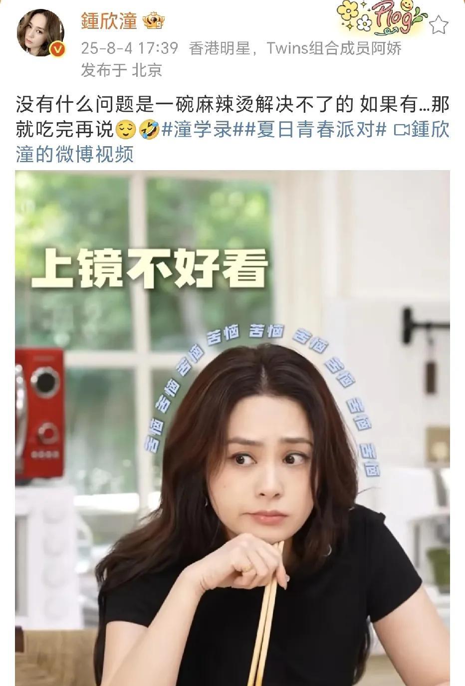 钟欣潼:那就吃完再说! 8月4日,钟欣潼在社交平台晒出了一段好可爱的视频。阿娇在桌上看到一碗麻辣烫,好想吃,但又有各种担心,怕上镜不好看,怕被同事看到怕… 不怕,麻辣烫就是我们中国的轻食[呲牙][呲牙]…好吃好吃,美味。