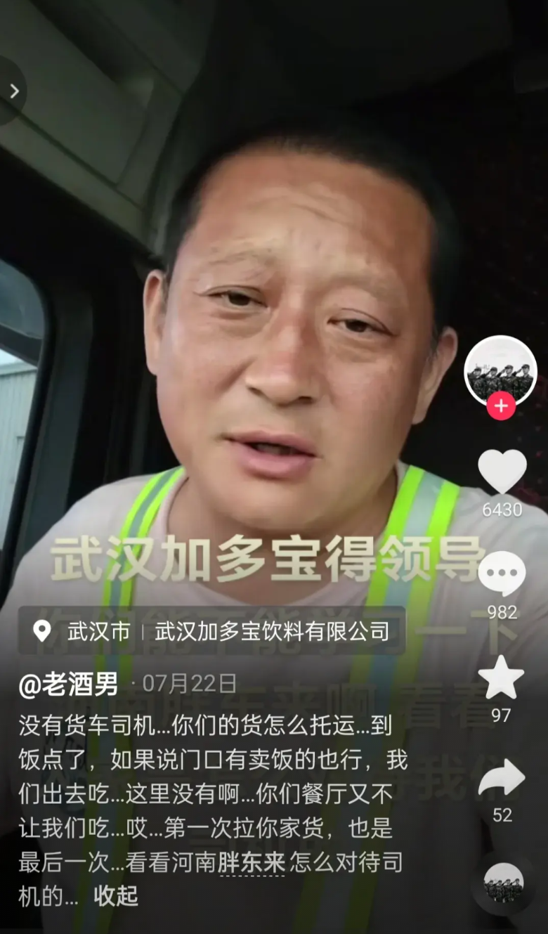 武汉,一名河南货车司机在加多宝工厂装货时,提出自费买一份食堂饭,被工厂工人一句“你吃没吃饭关我啥事”怼了回去。厂区周边荒无人烟,司机只能饿着肚子等工人吃饭、等货装完。无奈之下,这位司机拍视频公开喊话加多宝领导:“你们能不能学学胖东来,真把人当人看一看?” 据7月22日发布,在武汉加多宝饮料有限公司的厂区外,河南来的货车司机老张(化名)正守着满满一车货,肚子饿得咕咕叫,却怎么也进不去工厂食堂吃饭。这一幕,被他拍成视频发到网上,一下子引发了好多人的关注。 老张是个跑长途的货车司机,他平时起早贪黑的跑长途,就为了贴补家用。这次接了单给武汉加多宝工厂送货的活。他为了早点送到货,早上天还没亮就起床收拾,连早饭都没顾得上吃,然后就一路从河南赶来,到厂区时正好赶上饭点。 到了饭点,厂区本该来卸货的工人们都跑去食堂吃饭了。他们让老张在车里等着,可是越等,老张的肚子闻见饭香味,咕咕直叫。老张想着厂区周边荒无人烟,而且连个卖饭的小摊贩都没有,老张就想着能不能去工厂食堂买份饭吃,花多少钱都行,只要能填填肚子。 结果跟工厂里的工人一说,得到的回应冷冰冰的:“你吃没吃饭关我啥事” 。就这么一句话,把老张想吃饭的门给堵死了。就这样,老张忍着饥饿,在外面等了许久,老张开的货车,车厢里满满当当装的都是加多宝的货物。 车停在厂区里,他也不能随便离开,只能守在这儿等工人装货。饿着肚子的滋味可不好受,老张越想越委屈,自己风里来雨里去,给工厂送货,结果连口热乎饭都吃不上。 再想想河南胖东来对待司机的做法,人家那叫一个贴心,不仅有专门给司机休息的地方,吃饭也方便,对比之下,加多宝工厂这儿的待遇,简直天差地别。 一气之下,老张就拍了条视频,对着镜头跟武汉加多宝的领导喊话:“你们能不能学学胖东来,真把人当人看一看?”视频发出去后,很快就火了。 网友们纷纷留言,有人说:“货车司机太不容易了,挣的都是辛苦钱,工厂这么做太没人情味,胖东来的服务和人文关怀确实值得学,企业不能只想着赚钱,也得关心关心这些基层劳动者” 。 还有人说道:“货车司机不在乎吃饭花多少钱,只是能吃上一口热乎饭,这个要求很难吗?话说回来,厂子门口要是有卖饭的,你觉得司机会和职工去挤食堂吗?大家你一言我一语,都在讨论这件事,批评武汉加多宝工厂做法不妥的声音越来越多。 事情发酵后,武汉加多宝那边也有了动静。工厂相关人员回应说,后续会重视这件事,重新梳理对货车司机的服务流程,改善司机在厂区的待遇。老张这才知道,自己的视频起了作用,心里多少舒坦了点。 不过他还是希望,以后别再让其他司机遇到这种挨饿又受委屈的事儿,大家出来跑车都不容易,能有个体贴的环境,吃口热饭然后歇口气,比啥都强。 这件事儿传开后,好多人也跟着反思。货车司机是物流运输里的重要一环,他们常年奔波在路上,为企业送货而且为经济流通出力,可不少企业却常常忽略他们的基本需求。 胖东来为啥受追捧?就是因为它把每一个进店的人,不管是顾客还是送货的还是打扫卫生的,都当成需要尊重和关怀的个体。而这次武汉加多宝的事儿,也给其他企业提了个醒:企业发展不能光盯着业绩,人文关怀也是留住人心、树立好口碑的关键。 别等到司机们用视频和用声音去求助了,才想起来要改变,主动关心这些基层劳动者,把人文关怀落到实处,企业才能走得更远然后更稳。 对此你怎么看?欢迎大家在评论区留言讨论。