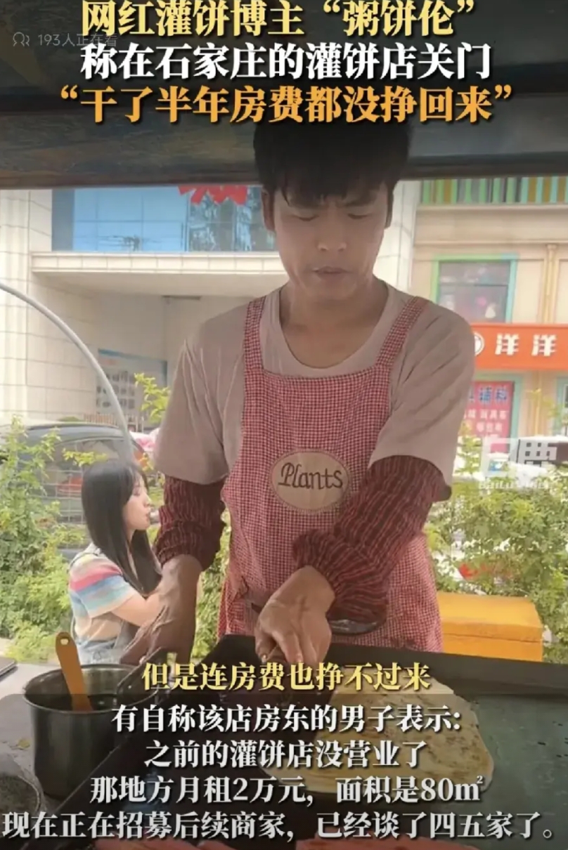不知是谁给他的自信,还是他挣到钱尝到流量的甜头了,不摆摊了转而盘店,还是卖鸡蛋灌饼。那个店面在石家庄一个步行街,80平,月租2万元。这还不包括水电,食材,人工等成本。2024年店里就有七八个员工,2025年初削减至五六人。他根本不知道,一个月的营业收入得多高才能维持运转。七月三十日,粥饼伦回应灌饼店因亏损已关闭,甚至连房费都没挣回来。