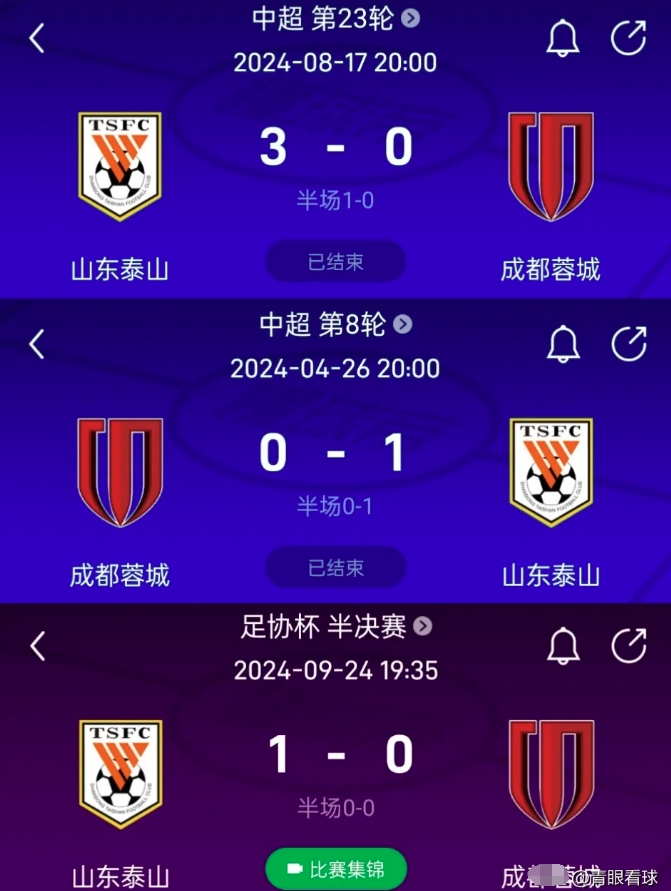 成都复仇,一年不晚:去年被泰山三杀,今年三杀泰山。 中超第19轮,成都主场2比1战胜泰山,本赛季三次对阵泰山全部取胜。 此前两次交手,成都分别在中超第4轮和足协杯1/8决赛,以3比0和3比1的比分战胜泰山。 上赛季,成都0比3、0比1、0比1被泰山三杀,三场比赛一球未进,被泰山完全压制。 去年,成都患上了恐鲁症。 今年,泰山患上了恐川症。