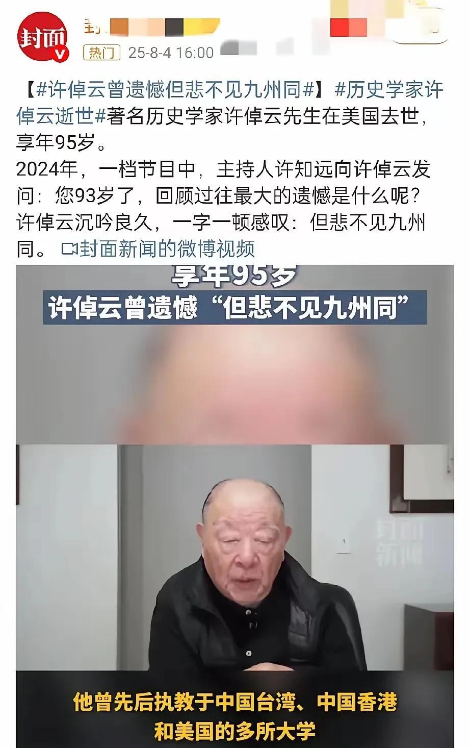 国内媒体,对所谓的“民国大师”、蛙岛名人、润人公知,总是充满了敬意! 年轻时定居美国,研究国内历史,年老感叹“但悲不见九州同”。又言去后埋于大陆,这样的人生轨迹委实看不明白。 昨天,历史学家许倬云在美国去世了!然后国内各大媒体都对他进行了正面报道,只因他说了一句,但悲不见九州同! 苦的时候没见他回,像不像那些小“公举”?“我最爱的是你,但迫不得已为了生活更好我只能跟了他,你要永远记住我哦”。 此人1930年就出生在全是别墅的鼓浪屿,他会跟普通人一样留在战乱的国内,建设祖国?他们有钱,有更多更好的选择,肯定是对于时局而言,择良木而栖,不可能回来过苦日子的,想多了。 说实话,他的历史观我不认可。讲的都是汉族士大夫、统治阶层角度的历史观。但人家是成功人士,长寿、有钱、有名、这个我认。 肉身在美国享受,精神上耗尽最后一声为祖国呐喊。就好比杜甫在大金王府里为大宋子民唱着“国破山河在,城春草木深”一样,感天动地! 生在国内,活在美国,死在美国,贡献也在美国,死了却要葬在国内,美其名曰落叶归根,不离不弃。这就是当代极端利己主义者统一行径,概莫能外。 当年寒枝不肯栖,到老空谈九州同!最有意思的是这些所谓的国学大师,号称学贯中西,竟然是去欧美学习我们的古代史。 我尊敬的人,都在烈士陵园。致敬所有为国牺牲的英雄,你们永垂不朽!