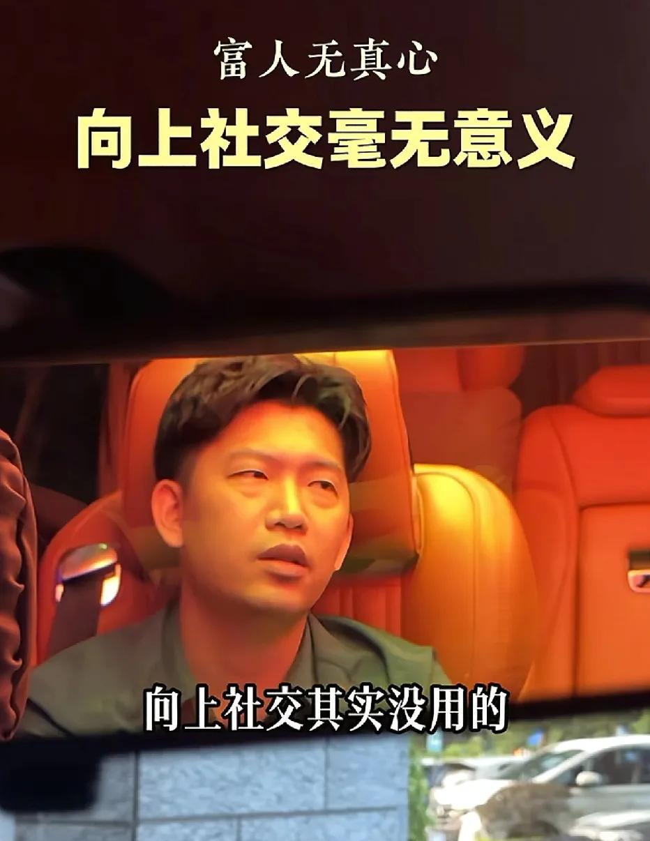 在社交这件事上,很多人觉得向上社交没用,可实际真是如此吗?现实就是,那些真正的有钱人,只有当你能为他们创造价值、帮他们赚钱时,才会带你一起玩。为了得到这个机会,你得像小狗一样伏在他们面前苦苦哀求。而且就算有了合作,赚了钱,大头也是人家拿走,你只能分得一点零头。这话听起来很残酷,但这就是向上社交的真相。 如果你开着价值30万的车,人家坐着价值500万的豪车,你们之间能有真心的交流吗?坐500万豪车的人看重的不是真心,而是利益。你想和他们交换资源?你有的资源,人家有什么搞不到的呢?你只有乖乖听话、给人家卖命干活,人家才可能给你点“赏赐”。 当你真遇到急事,厚着脸皮找他们借钱救急时,他们会怎么说?“不好意思啊,钱都在公司账上,项目资金都在流转,取不出来,而且别人还欠着我的钱呢,实在没办法帮你。”你看,和他们相处,不仅得不到什么好处,还会徒增焦虑。 要是你现在一年能挣个几十万,甚至更多,其实已经很不错了,真没必要自讨苦吃去向上社交。毕竟现在经济形势不好,那些有钱人的日子也不好过。与其费尽心思攀附他人,不如好好规划一下自己现有的资产,想办法提高点收入,这才是实实在在的。 要知道,攒小钱靠的是自己努力,发大财有时候真得靠运气。而幸福并不在于你赚了多少钱,而在于你能紧紧握住自己手中已有的东西,珍惜当下,把自己能把握的事做好,你说是不是这个道理呢?