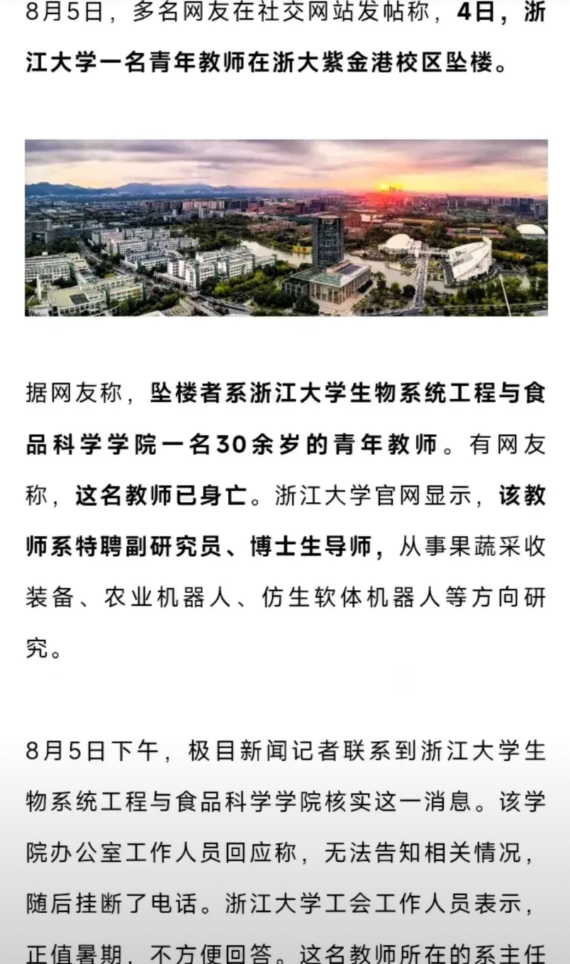 刚刚刷到消息,浙大一教师坠楼身亡! 该教师35岁,就职于生物与食品学院, 昨日(8月4日),在紫金港校区坠楼。 由于事发中午,被很多人看到了。 他本科就读于浙江工业大学, 硕士、博士均在浙江大学攻读, 2020年成为浙大特聘副研究员、博导。 具体原因尚不明确,后续会加以说明。