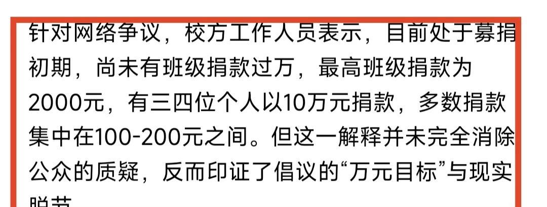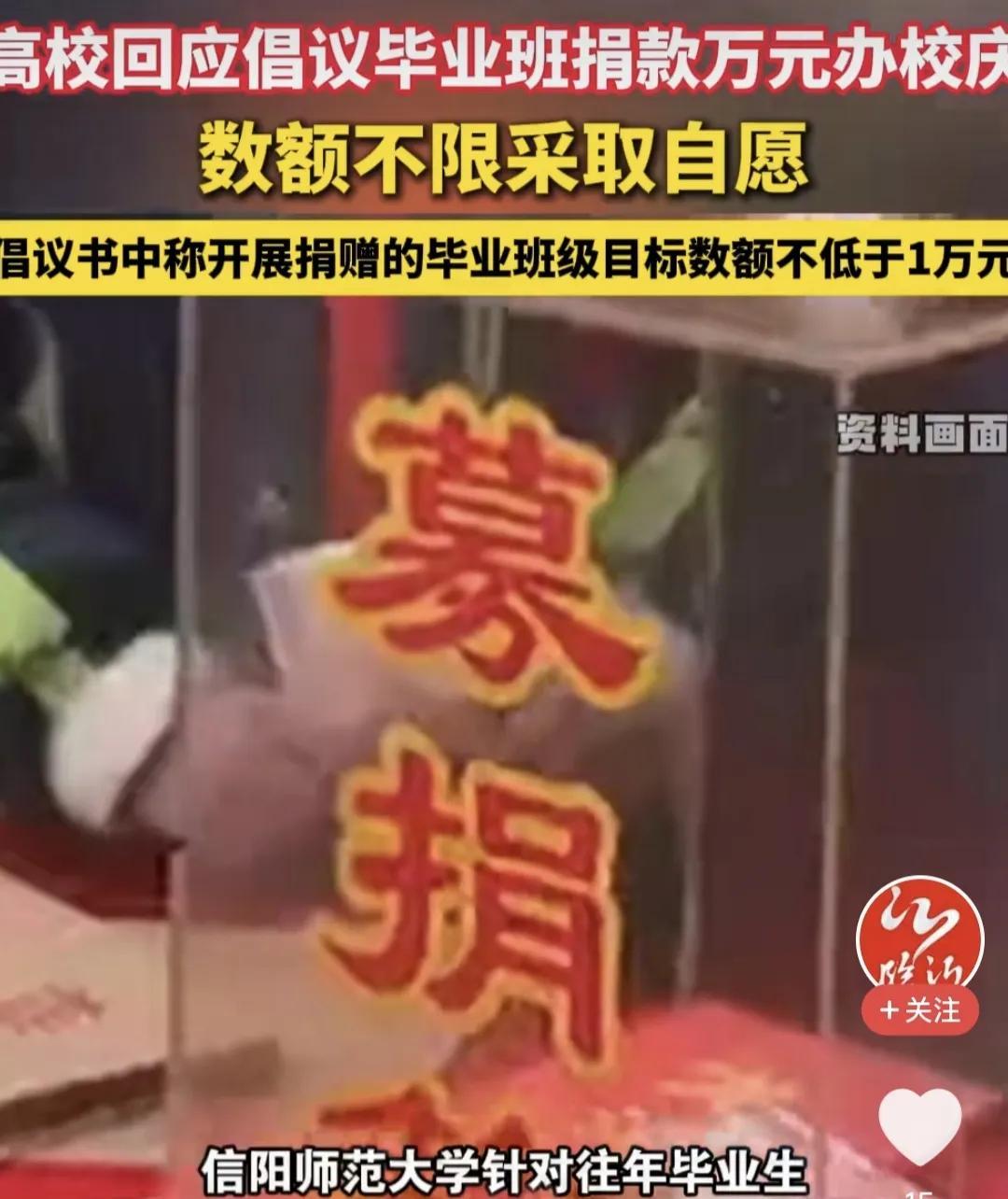 信阳师范大学校庆这波捐款真的有点尴尬了。信阳师范大学50周年校庆,发了一个“千班万元”捐款倡议,主要目标是历届毕业班。其实算算账的话,如果毕业班都能达到捐款万元的目标,这笔钱真的是不少啊。但校友好像也不太给面子,目前捐款额最高的班级也仅仅只有2000元,多数捐款在100到200元之间,这是真的很尴尬。 更尴尬的事情在后面,这事儿被网友放到网上了,有网友调侃,这所大学就缺一个雷军,有一个雷军,一切都不是问题。把捐款作为一个目标任务,定位到每个毕业班上面,第一是高估了校友的经济实力,第二是高估了校友对学校的认可度。#教育# #信阳师范大学#