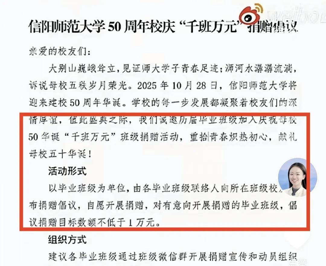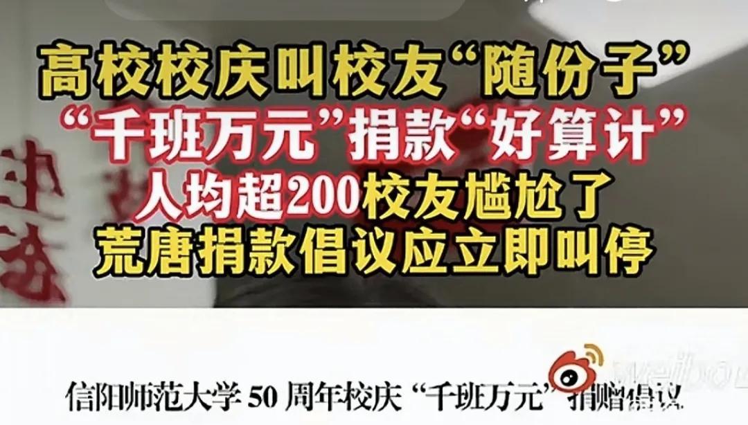 信阳师范大学校庆这波捐款真的有点尴尬了。信阳师范大学50周年校庆,发了一个“千班