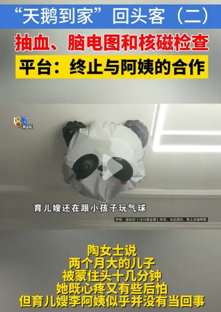 杭州的陶女士发现,某大型家政平台上花了三万多元找的育儿嫂,却让孩子“惊跳反射”盖住了头?!