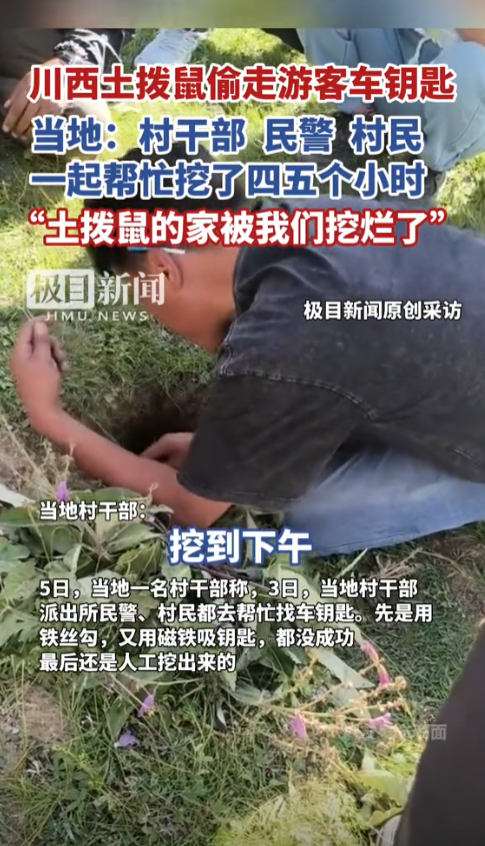 根据极目新闻8月6日的报道,游客的钥匙被偷走之后,当地的村干部、民警、村民一起帮忙挖了四五个小时,土拨鼠的家都被他们挖烂了。
