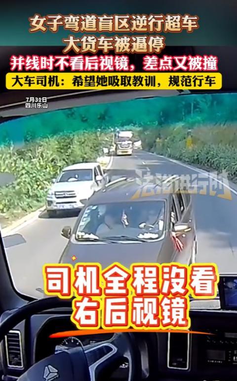 “太吓人了!”7月31日,四川乐山,一女子在山路开车,弯道盲区逆行超车,直接把对向来的货车逼停!更离谱的是,并线时,不看后视镜,后方又开来一辆大车,差点撞上,好在大车及时按下喇叭,网友:自作孽不可活! 那天天气不算差,山路上车不算多,但弯道一个接一个,路边就是陡峭的山坡,开车本就该加十二分小心,可这位女司机不这样想,开着车在山路上窜得挺欢。 走到一个急弯处,她不当回事,估计是嫌前面的车慢,打了把方向盘就往对面车道冲,刚超到一半,对面拐过来一辆大货车,两车差点就撞上,货车司机吓得赶紧猛踩刹车,才算把车停在路中间,把对向车道堵得严严实实。 这还不算完,女司机见对面被堵住,又想并回原车道,按说并线前总得看看后视镜吧,她偏不,方向盘一掰就往回拐,哪成想,身后不远正有辆大车往上爬,眼看就要撞上。 大车司机反应快,扯开嗓子按喇叭,“嘀 —— 嘀 ——”的长鸣声震得山响,女司机这才慌了神,猛踩刹车,而大车更是打方向盘,俩车几乎是擦着身子过去的,路边的碎石都被碾得乱飞。 这时候监控才看清,她车里可不是只有自己,副驾坐着个女的,后排黑压压一片,全是小孩,看那样子最大的也就七八岁,小的可能才刚会坐,就这么带着一车子人,还敢在山路上这么疯开,这可把大货车司机气坏了。 大货车司机把当时的情况拍下来发到网上,评论区炸了,有人说:“这哪是开车,这是拿一家子命开玩笑啊”,还有人骂:“自己想死别拉着孩子,真是自作孽不可活!” 说句实在话,山路开车,最忌讳的就是抢那几秒钟,弯道超车、不看后视镜,哪一样都是能要命的操作,尤其是车里还带着孩子,更得把安全放在第一位。 信息来源:《女子弯道盲区逆行超车,直接把货车逼停》法治进行时