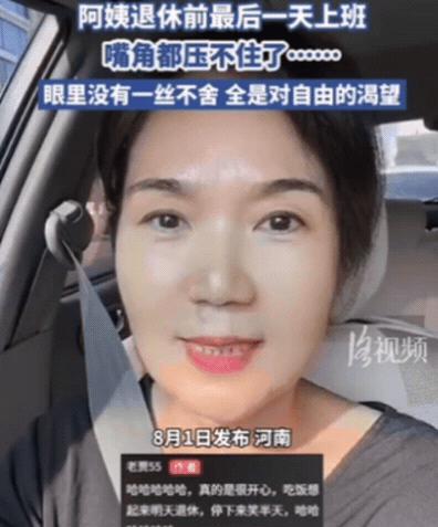 “嘴角连AK都压不住了!”河南,一位阿姨开车上班,结果,走到一半,突然狂笑不止!眼泪都差点笑出来了,原来,这是她退休前最后一天上班,明天就正式的退休,早上想几点钟起床,就几点钟起床,想到此处,嘴角都压不住了……网友:眼里没有一丝不舍,全是对自由的渴望! 几十年来,河南一位阿姨日日早起,风雨无阻,有时候发烧了也不敢请假,因为怕影响工资和考核。 工作是她撑起生活的唯一方式,特别是儿子小时候,学费、生活费、各类支出压得她喘不过气,哪怕工作再累、起床再难,她也咬着牙坚持。 这一天清晨,天还没完全亮,街上的行人和车辆稀稀拉拉,阿姨早早地起了床,像往常一样穿好衣服,洗漱完毕后,熟练地拎起包便出门了。 可就在车刚拐出小区门口,方向盘还没捂热,她突然“噗嗤”一声笑了出来,嘴角怎么也压不住,一边开车,一边笑得眼泪都快冒出来了。 “今天再上最后一天班,明天就正式退休了,我早上想几点起来就几点起来。” 原来这天是她职业生涯的最后一天,再坚持这短短几个小时,她就正式退休了! 明天开始,她早上想几点起就几点起,不用再听闹钟刺耳地响,更不用担心迟到扣全勤奖。 一路上阿姨的嘴角根本没合上过,眼睛都快笑眯成一条缝了。 她想象着,明天不用被闹钟吵醒,不用在慌乱中洗漱、找衣服、不用在红绿灯下焦急看表,更不用一睁眼就被各种工作群的消息轰炸得头大。 什么“会议通知”“临时汇报”“群里@所有人”,统统再见! 以后是睡到自然醒,想喝茶就泡壶茶,想跳广场舞就约上老姐妹。 一想到以后时间是自己的,生活是自己的,连晚高峰都可以潇洒绕过,阿姨就忍不住想大声唱两句。 谁说只有年轻人才能快乐奔放?人生下半场的快乐,从告别打工开始! 旁人或许笑她:“至于这么高兴吗?” 但只有真正经历过早八晚九、全年无休,半夜被微信惊醒、节假日也要随时待命的人,才懂那种从灵魂深处渗出来的轻松感。 说到底,阿姨的笑之所以能传遍网络,引来无数“打工人”的共鸣,正是因为它笑出了大家的心声。 人们羡慕的,与其说是退休这个结果,不如说是退休所代表的那份“我的时间我做主”的底气,和“不用再看人脸色”的自由。 阿姨的视频一夜之间爆火全网,她那笑得合不拢嘴、连方向盘都握不稳的模样,戳中了无数打工人的心。 一句“明天我想几点起就几点起”,更是成了网友们梦中情话的天花板。 弹幕和评论区里,全是羡慕的“泪目式刷屏”: “我也想退休,最好明天就能退!” “原来真正的自由,是不用定闹钟。” 但就在大家纷纷幻想着退休后悠哉日子的同时,阿姨又发来“后续通报”:刚退休,我就找到工作了! 这下评论区瞬间哗然:“啊?不是才自由一天吗?”、“怎么就又上岗了?”、“阿姨你不是说要睡到自然醒吗?” 原来,她接的“工作”,不是别的,是去海南给儿子看娃! 于是就有网友调侃:“刚出职场虎口,又入育儿狼窝,阿姨这是从‘打工人’变‘带娃人’。” 也有网友暖心留言:“其实说到底,阿姨心里是幸福的,能帮上孩子、还能抱着孙子,这种生活,也挺甜。” 不管“退休第一站”是不是养老,起码选择权回到了阿姨手里。 这种自由,才是真正的“退休快乐”。