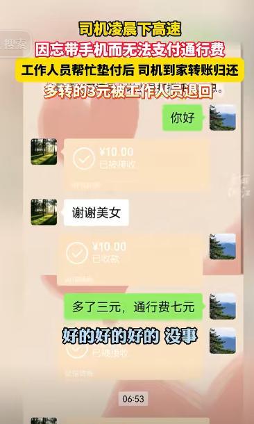 浙江又火了!一女子凌晨下高速,发现忘带手机无法支付高速费,不料,工作人员二话不说就帮忙垫付,女子到家后就转账归还,而工作人员的做法,也让众多网友为其点赞! 杭州的一名女子,正在家中看电视的她,突然接到了一通电话,应该是有什么急事,随后她便赶紧换好衣服就出门了,在路途中她忙着赶路也就没空想其它的事情,一门心思的全放在开车上。 然而,就在她凌晨抵达千岛湖收费站准备下高速时,工作人员提醒她本次的过路费为7元,看她用微信还是现金的时候,该女子竟然发现自己的手机忘家里面了。 女子心想自己的衣服里面有现金,正在她掏口袋的时候,她想起来自己出门前刚换的衣服,没有把原来那个衣服里面的钱掏出来,女子瞬间不知道该怎么办了。 这是工作人员很耐心的向班长报告这名女子的情况,班长见状也没有多说什么,二话不说的就将这7块钱给先垫出来了。 女子听到时候,十分感激,她不敢想象自己,要是没遇见这名好心的工作人员,还需要在这里等很久,让家里人送来钱之后才能走。 随后她便立马就向工作人员要了电话号码,说自己在回家之后就回家他的微信,转账给她的,并在此说出:“谢谢”二字, 工作人员也是亲切回答道:“好的好的,没事”,声称自己也是经常会忘记一些事情,就算是心里面刚想过的事情,过一会该忘还忘,就这样她拿自己的例子安慰着女司机。 女子到家之后立刻就加上了这名工作人员的微信,凑了个整,直接转给她了10块钱,但工作人员告知女子,转多了,通行费只有7元,随后又给退回了3元。 7块钱虽然不多,但却能表达出人人之间互相帮助的情怀,总而言之,爱是不能用金钱来衡量的。 对此,你有什么看法呢?