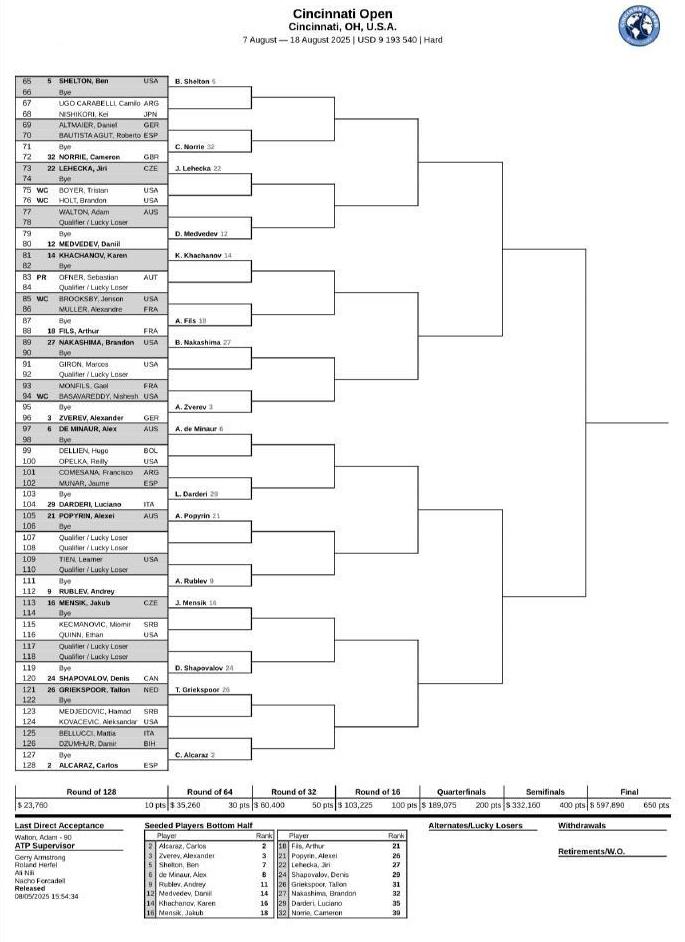 #网坛风云# 阿尔卡拉斯、辛纳在辛辛那提大师赛重聚,两人将领衔出战。 前八种子对位: 辛纳[1] - 穆塞蒂[8] 弗里茨[4] - 鲁内[7] 谢尔顿[5] - 兹维列夫[3] 德米纳尔[6] - 阿尔卡拉斯[2] 中国选手首轮: 商竣程vs埃切维里 布云朝克特vs丰塞卡