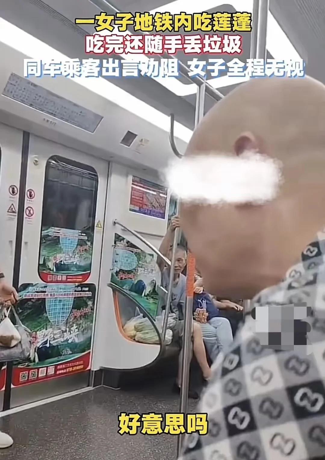 武汉,一名女子在地铁车厢上吃莲蓬,却将残渣随意丢弃在地上,对面一位年长的大哥出言劝阻时,她还全程无视。这一幕被车厢内的乘客拍下来上传到了网上,登上了实时热搜。 据《潇湘晨报》8月5日报道,视频中一名穿粉色衣服的女子坐在靠门边的座椅上,翘着二郎腿,手里剥着莲蓬在吃。 绿莹莹的莲子一颗一颗往嘴里塞,剥下来的莲壳呢,随手就往她脚边扔下去,没一会的功夫,她脚边就散落着大量的残渣。 站在她旁边的小伙子皱着眉往旁边挪了挪,生怕女子扔下去的残渣弄到他的小白鞋。 车厢广播里循环播放着 “请勿在车厢内饮食、丢弃杂物”的提示音,女子却像是没听见,低着身悠闲地吃着她的莲子。 对面一位年长的大哥估计是看不过眼了,出声说了一句,“好意思吗?” 车厢里其他乘客也侧目看过去,结果那女子眼皮子抬都没抬,继续剥着莲子,嘴巴是一刻没停。 那淡定劲,好像大哥说的是别人。 事后,有同车的乘客把这一幕发到了网上,这一视频看得众人切齿愤盈,当天“武汉地铁女子吃莲蓬丢残渣”的话题就冲上了本地热搜。 有网友截图放大看女子的穿着,觉得该女子穿得挺光鲜,怎么会做出这么难看的行为。也有人表示这不仅仅是丢垃圾的问题,而是对公共空间基本尊重的缺失。 面对舆论的发酵,武汉地铁官方很快做出回应。 地铁内确实设有流动巡视人员,但 并非每趟列车都有,尤其是早晚高峰时段,人手紧张很难做到全程盯控。 他们同时呼吁乘客,遇到此类不文明行为应及时向工作人员反映,他们会第一时间到场处理。 但这个回应并没有平息争议,有网友追问:等工作人员到场,人家都下车了,有什么用? 那么,该女子在公共空间中的不文明行为,就无法对她落实处罚吗? 在《城市轨道交通客运组织与服务管理办法》第三十六条中,关于乘客不得影响城市轨道交通运营秩序的规定行为中,其中就有下列两条禁止性规定: (一)在列车内进食(婴儿、病人除外); (二)随地吐痰、便溺、乱吐口香糖,乱扔果皮、纸屑等废弃物。 女子在地铁上吃莲蓬,还把大量莲壳和杂物散落在地上,就以上两条规定,女子依然都违反了。 《武汉市轨道交通管理条例》2020年修订后的条例进一步细化了处罚标准,违反规定在车厢内进食的,由轨道交通运营单位责令改正,拒不改正的,处 50 元以上 200 元以下罚款。 在车站随地吐痰、便溺、吐口香糖、乱扔废弃物等行为之一的,处一百元以下罚款,情节严重的,处二百元以下罚款。 不过现实中,这样的处罚很难落实。 根据《民法典》第八百一十九条规定,承运人应当严格履行安全运输义务,及时告知旅客安全运输应当注意的事项。旅客对承运人为安全运输所作的合理安排应当积极协助和配合。 地铁公司要设置警示标识、播放提示音,建立有效的巡查和制止机制,但在早晚高峰的大客流压力下,要求运营方做到每趟车都有巡视人员显然不现实。 回到武汉地铁的这起事件,它也在提醒我们,公共文明的养成既需要法律的刚性约束,也需要道德的柔性引导。 近年来,各地都在推进文明行为立法,但法律终究是底线要求,真正的文明更多来自内心的自觉。 对于这件事,大家又是如何看待的呢? 素材来源于《潇湘晨报》8月5日报道。 #头号创作者激励计划#