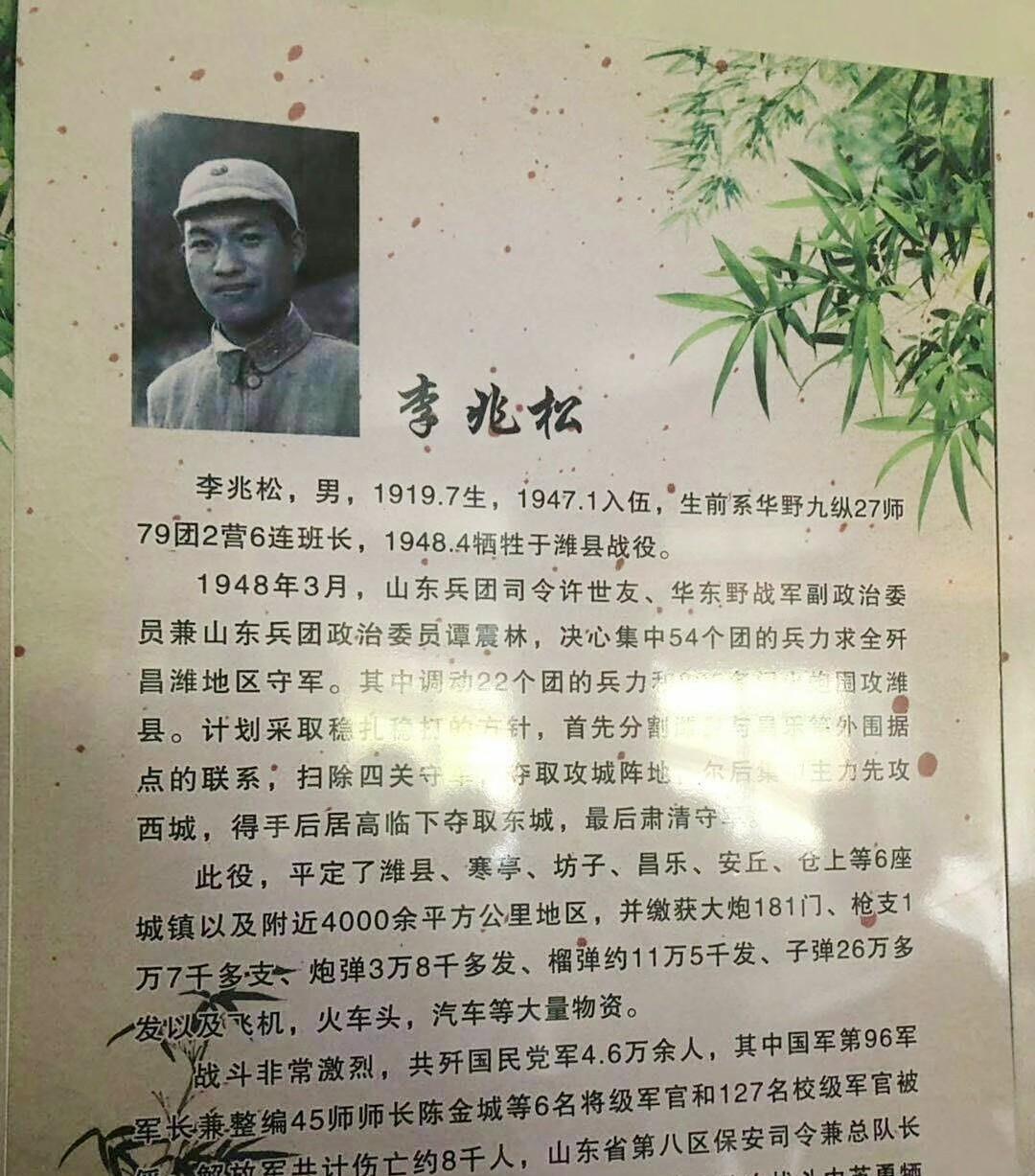 两张图片的难解之谜! 图1是1944年,美国记者福尔曼在延安拍摄。照片上仪表堂堂的八路军,看架势像个干部。 图2来自网络,是一张烈士简介的宣传展板,而烈士的照片正是图1中的八路军。他叫李兆松,1919年出生,1947年入伍,生前系华野9纵27师的一个班长,1948年在潍县战役中牺牲。然而让人费解的是,照片是同一个人,怎么入伍时间差了3年?按理说,我军对烈士履历的审核是十分严肃的,一般不会有太大的出入。但1947年参军的李兆松,照片上怎么穿着八路军军装?是相片贴错了,还是时间错了? 第一张照片,来自福尔曼的私人相册,照片只标注了时间和地点,没有介绍八路军的名字。而他军服上第18集团军的臂章,意味着参军的时间至少在1944年以前。他军服领子上的红领章,是陕甘宁留守兵团的特有标志,这支部队最终成为西北野战军的主力。而李兆松烈士所在的华野9纵,是由山东八路军胶东军区的几支部队改编而成,两者之间并无交集。 那么,问题出在哪里?延安的这位八路军和李兆松烈士是一个人吗?希望了解的朋友不吝赐教。 向英勇抗日的八路军致敬!李兆松烈士永垂不朽!