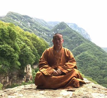 这是少林前住持释永信身穿僧衣在大石头上参禅打坐。释永信从小就与佛有缘。他的祖父母
