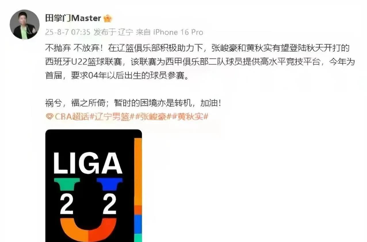 8月7日,传来了辽宁男篮一个好消息! 据辽宁媒体人田掌门最新爆料,张峻豪和黄秋实即将征战西甲联赛。此消息一出,立刻引发了球迷的讨论及热议!真应了那句话,天无绝人之路!爱拼的男孩运气不会差!真心的佩服我们辽宁男篮,真的是有担当+有魄力+有能量+有能耐!更要佩服辽宁男篮的助教乌戈-洛佩斯,正是他依靠西班牙的人脉关系,且从中斡旋,张峻豪和黄秋实征战西甲的事,才得以所求如愿,心想事成!正所谓塞翁失马,焉知非福!张峻豪、黄秋实未来可期。