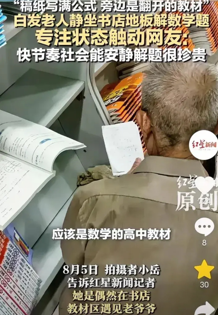 女孩心中微动:这快节奏社会里,能如此静心解数学题,太难得。老人佝偻着背,却透着股执拗的认真。
