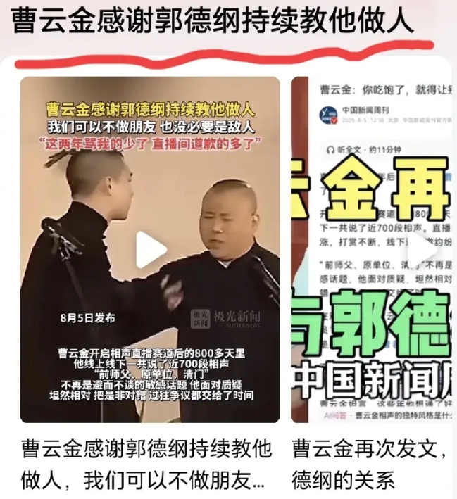曹云金演出现场,粉丝送来一条横幅:横幅上赫然写着:"年少不知曹刘好,错把郭于