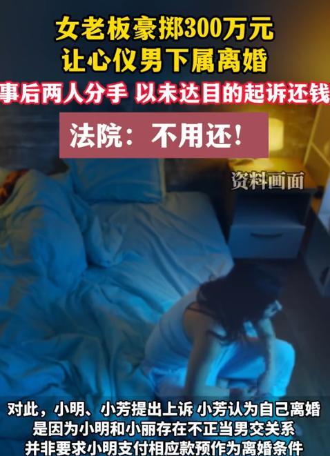 “300 万买段感情,同居一年就黄了?电视剧都不敢这么演!”重庆,一女老板看上年轻男员工,两人发生了关系,女老板想让男子离婚,岂料,男子妻子得知后表示:只要女老板给她300万,她就和丈夫离婚!女老板痛快的给了钱,可谁知,她与男子仅同居1年后就分手了,于是将男子前妻告上法院,要求归还300万,法院判决亮了! 40 岁的张莉把小作坊做成行业里的佼佼者时,在部门聚餐上注意到了新来的技术员王浩。这个 28 岁的小伙子不仅报表做得清楚,记得她对芒果过敏,连递文件都会特意把尖锐的边角朝自己。 这种细致,像根羽毛,挠得这位女强人心里直发痒。 两人的关系在加班夜慢慢变味,直到王浩手机弹出妻子的视频电话,张莉才知道自己卷入了别人的婚姻。 可她向来强势,听王浩支支吾吾说 “我老婆不好说话”,直接把银行卡扔过去:“明天带她来,要多少钱我都给。” 见面的咖啡馆里,王浩的妻子刘娟没吵没闹,盯着张莉推来的卡,慢悠悠地说:“300 万,今天就能办离婚。” 张莉以为她在狮子大开口,刘娟却掏出离婚协议,指着条款:“我啥都不要,就这 300 万,得写进补充协议,算补偿金。” 王浩在旁边想插话,被刘娟一眼瞪了回去。 钱到账那天,刘娟拿着离婚证走出民政局,回头对张莉说:“人给你了,看好了。” 这话当时听着像气话,后来却成了张莉的心病。 跟王浩住一起后,日子并没按想的来。以前会记得她胃不好备着胃药的人,渐渐把臭袜子扔得满地都是,她谈成大生意时,他还抱怨 “又要忙到半夜”。 争吵从 “别总提你前妻” 变成 “我怎么会看上你”,最后一次吵翻,是张莉发现王浩偷偷给刘娟转了 5000 块,还说 “还是你懂我”。 “这 300 万花得比扔水里还冤。” 张莉摔门走的时候,就一个念头:把钱要回来。一审法官还真站她这边,说 “破坏他人婚姻的赠与无效”,可她刚拿到胜诉判决,就听说刘娟上诉了。 二审开庭,刘娟的律师拿出关键证据:离婚协议补充条款里 “自愿补偿 300 万” 旁边,有张莉作为见证人的签名。 “我当事人是受害者,这笔钱是过错方通过第三方给的赔偿,凭啥无效?” 张莉这才想起,当初为了让刘娟赶紧签字,她确实签了名,当时只当走个过场。 法官敲下法槌时,阳光照在刘娟脸上。她经过张莉身边时停了下:“张总,做生意你行,但感情里太精于算计,容易栽跟头。” 这话没多少得意,倒像句提醒。 网友看到刘娟拿着判决书的照片,评论区炸开了锅。有人说 “干得漂亮”,有人替张莉可惜 “300 万买个教训,不便宜但值”。 还有人扒出王浩后来的动态,换了新工作,朋友圈里有和陌生女人的合影,地点还是他和张莉常去的餐厅。 这场闹剧里,没人是赢家。张莉在公司会上突然说 “最近犯了个低级错”,没细说,但全公司都懂。 刘娟用那笔钱开了家甜品店,有人看到她在蛋糕盒上贴纸条:“好好爱自己,比啥都强。” 王浩听说联系过刘娟,电话里只换来一句 “路是你选的,别回头”。