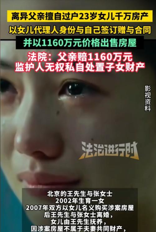“防不胜防!”2025年,北京,一男子在与妻子离婚后,擅自将女儿名下的房产过户给自己,并以1160万元的价格卖掉房子,女儿发现后,一气之下,将父母告上法庭,要求归还,网友:太离谱了! 事情得从二十多年前说起,2002年的时候,男子和老婆生了个女儿,到了2007年,两口子手头宽裕了,就想着给孩子留点家底,特意以女儿的名义买了套房,那会都这么做,觉得写孩子名字踏实,将来也是孩子的保障。 没成想,日子过着过着就散了,后来两人离了婚,女儿判给男子抚养,当时离婚分财产的时候,因为这房子在孩子名下,不算夫妻共同财产,就没提这事儿,房子还一直是女儿的名字。 谁能想到,2016年的时候,男子动起了歪心思,他自己当女儿的“代理人”,跟自己签了个赠与合同,说女儿把房子无偿送给自己了,就这么自导自演一番操作,居然真把房子过户到自己名下了。 没过多久,他又把这房子卖了,一下子拿到1160万,这事儿藏了快十年,直到今年,23岁的女儿长大了,想起来自己名下还有套房,一查才发现早没了,自己啥都不知道,房子怎么就成别人的了? 更让她心寒的是,这事儿居然是亲爹干的,一气之下,姑娘把父亲告到了法院,要求赔偿损失,她说,当年父亲作为监护人,趁自己未成年,偷偷把房子卖了,这明显是侵犯了她的合法权益。 有人说:“虎毒还不食子呢,这爹心也太狠了”,还有人感慨:“做父母的,怎么也得守住底线,不能动孩子的东西啊”,说实在的,父母给孩子留家产,本是一片苦心。 可要是像这位父亲这样,把孩子的东西当成自己的,那可就太不应该了,毕竟,做父母的,最该给孩子的是安全感,而不是背后捅刀子,最终,法院判父亲返还这笔钱,这父女情分,怕是很难回到从前了。 信息来源:《离异父亲擅自过户23岁女儿千万房产以女儿代理人身份与自己签订赠与合同并以1160万元价格出售房屋 法院:父亲赔1160万元监护人无权私自处置子女财产》法治进行时