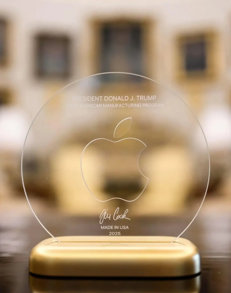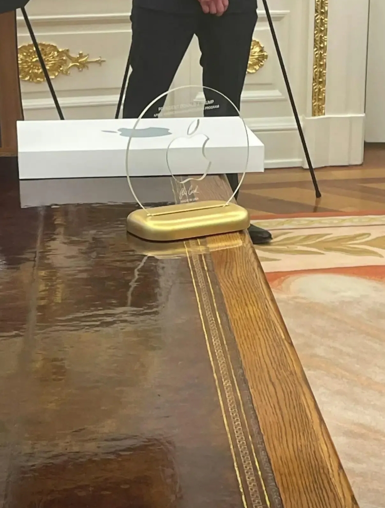 不服不行,再牛的科技公司来了也得送礼! 苹果公司CEO库克送给特朗普一件特殊礼物 。这件礼物是一块由iPhone玻璃制造商美国康宁公司生产的玻璃,呈大圆盘状,上面刻有苹果的标志 。玻璃上方印有特朗普的名字,下方有一个疑似库克的签名,以及“美国制造”和“2025”的字样 。玻璃镶嵌在一个24K金底座上,该底座来自犹他州 。库克表示,这块玻璃是由一位在苹果工作的“前美国海军陆战队下士”设计的 。 库克赠送礼物这一行为,可能是为了庆祝苹果公司与美国政府在投资方面的合作,也可能是为了展示苹果公司对“美国制造”的支持。