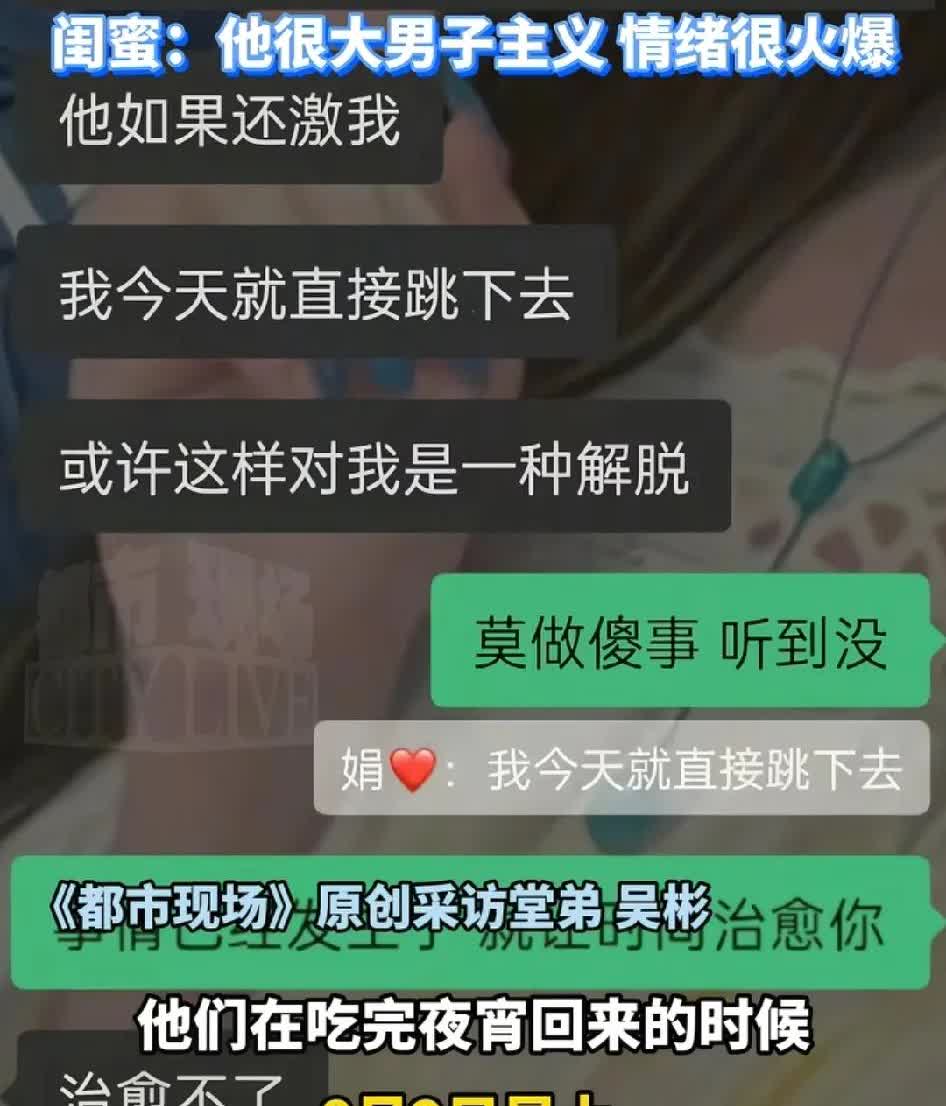 29岁女子遭到男友挥拳殴打从25楼跳下身亡,此前还刺激说: 放心她不会去死的! 男友从事放贷行业,有大男子主义倾向,多次殴打,一句“她不会去死”成催命符,男的有点料,开保时女孩子,挺漂亮的。这种放贷都是放高利贷,有的还不上就肉偿逼女的,这种放贷的就是流氓垃 杀伤力最大的是那句“她不会去死的”估计当时也是气急了,头脑是混乱的,听到这句话做出不理智行为。人在情绪失控的时候会做出任何不理智的行为,如果这个男士当时走开,闺蜜劝说冷静以后肯定会想办法解决问题而不是走上绝路,所以永远不要把一个人逼上绝路,有时候生死就在一瞬间