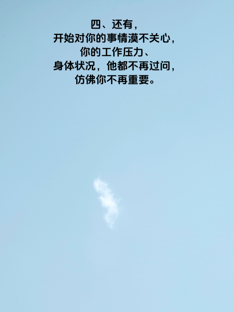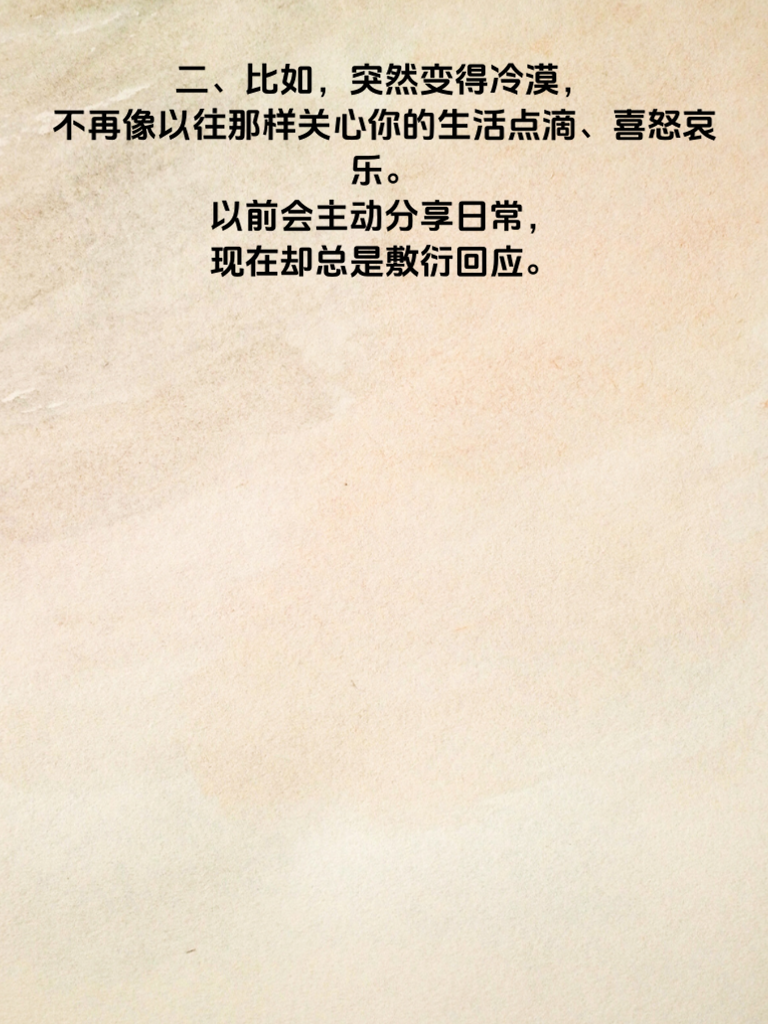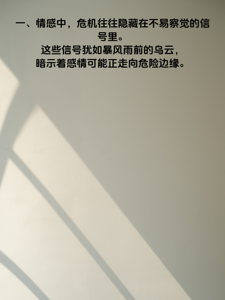 一、情感中,危机往往隐藏在不易察觉的信号里。这些信号犹如暴风雨前的乌云,暗示着感情可能正走向危险边缘。 二、比如,突然变得冷漠,不再像以往那样关心你的生活点滴、喜怒哀乐。以前会主动分享日常,现在却总是敷衍回应。 三、频繁的争吵且毫无解决问题的意愿,每次都以冷战收场,这可不是感情健康的表现。 四、还有,开始对你的事情漠不关心,你的工作压力、身体状况,他都不再过问,仿佛你不再重要。 五、社交上的异常也值得警惕。总是背着你和某些人频繁联系,甚至对你隐瞒一些社交活动。 六、当出现这些信号时,不要慌张,但也不能忽视。冷静下来,找个合适的时机,坦诚地和对方沟通,了解背后的原因。如果对方不愿正视或改变,那你可能需要重新审视这段感情,保护好自己,做出对自己最有利的决定。