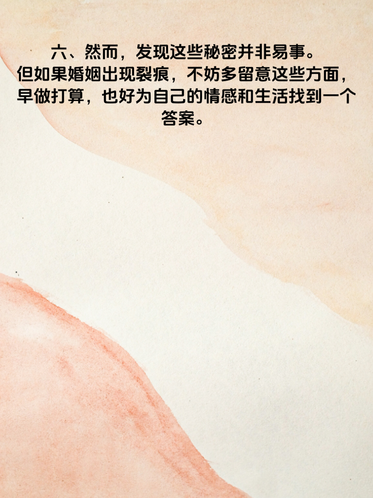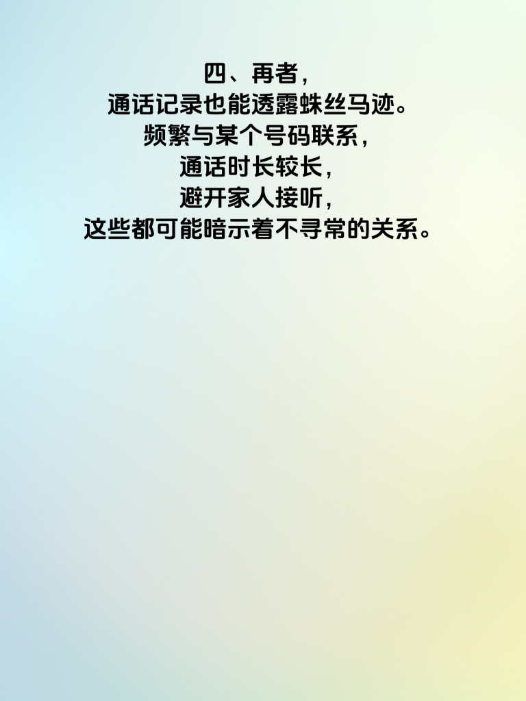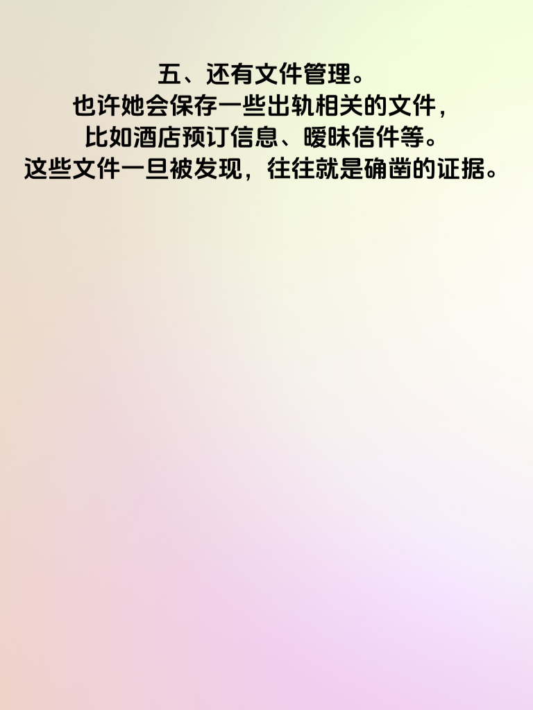 一、婚内出轨,这是一个沉重且敏感的话题。当婚姻中出现这样的危机,女生的手机往往藏着诸多秘密。 二、首先,社交软件记录不容忽视。她可能在聊天软件里与出轨对象频繁交流,那些甜蜜的话语、偷偷的约会安排,或许都藏在不起眼的聊天记录中。仔细查看聊天时间、频率,以及是否有大量删除记录的痕迹。 三、相册也是关键所在。有没有一些陌生场景的照片,或者与特定男人的亲密合影?甚至可能有一些私密视频,记录着她不愿让人知晓的瞬间。 四、再者,通话记录也能透露蛛丝马迹。频繁与某个号码联系,通话时长较长,避开家人接听,这些都可能暗示着不寻常的关系。 五、还有文件管理。也许她会保存一些出轨相关的文件,比如酒店预订信息、暧昧信件等。这些文件一旦被发现,往往就是确凿的证据。 六、然而,发现这些秘密并非易事。但如果婚姻出现裂痕,不妨多留意这些方面,早做打算,也好为自己的情感和生活找到一个答案。