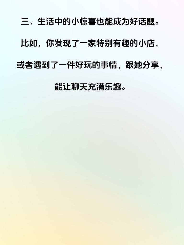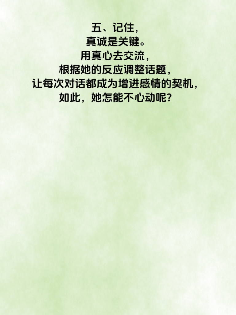 一、追女生时,选对话题至关重要。一个能让她心动的话题,就像一把打开她心门的钥匙。那么,哪些话题能有这样的魔力呢? 二、首先,可以聊聊她的兴趣爱好。如果她喜欢阅读,就谈谈最近读过的好书,分享彼此的感悟;若她热爱旅行,讲讲旅途中的趣事。这样能让她感受到你对她的关注和理解。 三、生活中的小惊喜也能成为好话题。比如,你发现了一家特别有趣的小店,或者遇到了一件好玩的事情,跟她分享,能让聊天充满乐趣。 四、梦想与目标也是不错的切入点。问问她未来想成为什么样的人,有什么计划。这会让你们的交流更有深度,也能让她看到你对她内在世界的好奇。 五、记住,真诚是关键。用真心去交流,根据她的反应调整话题,让每次对话都成为增进感情的契机,如此,她怎能不心动呢?