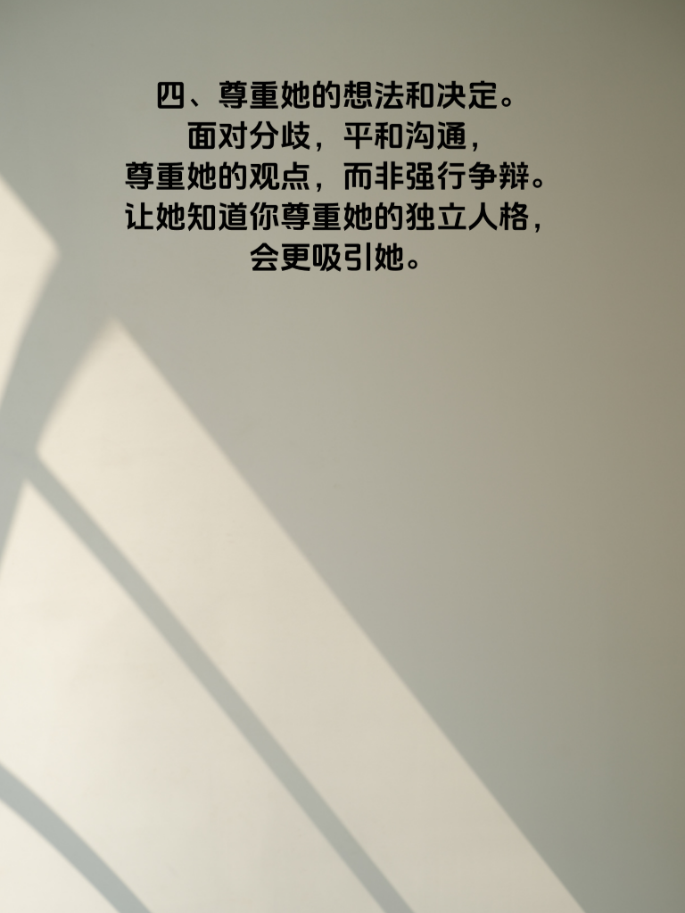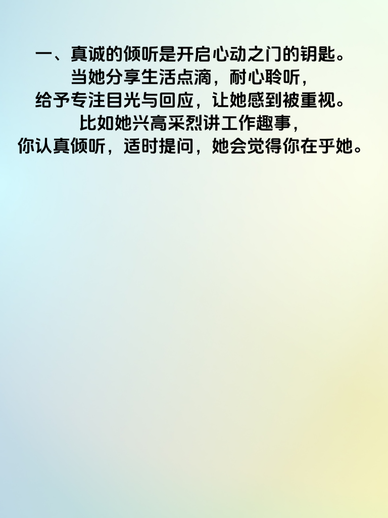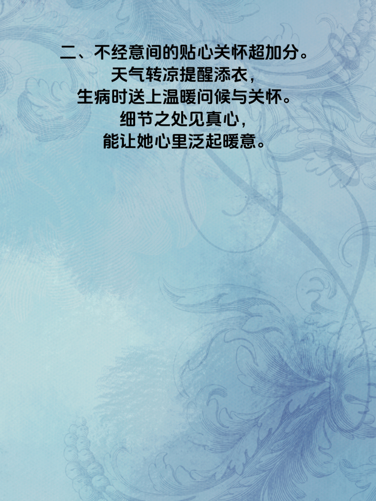 一、真诚的倾听是开启心动之门的钥匙。当她分享生活点滴,耐心聆听,给予专注目光与回应,让她感到被重视。比如她兴高采烈讲工作趣事,你认真倾听,适时提问,她会觉得你在乎她。 二、不经意间的贴心关怀超加分。天气转凉提醒添衣,生病时送上温暖问候与关怀。细节之处见真心,能让她心里泛起暖意。 三、展现你的幽默风趣。讲个好笑的笑话,开个恰当的玩笑,让相处氛围轻松愉快。但别过度,把握好度,能让她在你身边时刻充满欢笑。 四、尊重她的想法和决定。面对分歧,平和沟通,尊重她的观点,而非强行争辩。让她知道你尊重她的独立人格,会更吸引她。 五、偶尔制造小惊喜。一束鲜花、一份小甜品,无需贵重,重在心意。能瞬间点亮她的心,让她感受到你的爱意与用心。