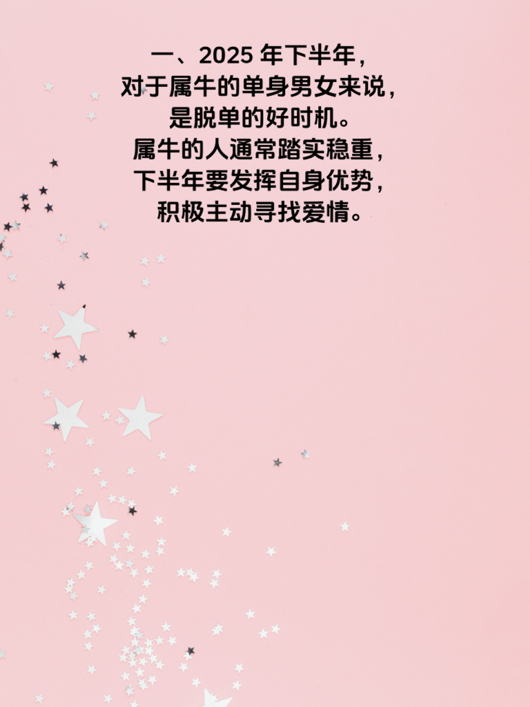 一、2025 年下半年对于属牛的单身男女来说,是脱单的好时机。属牛的人通常踏实稳重,下半年要发挥自身优势,积极主动寻找爱情。 二、拓展社交圈是关键。可以多参加一些兴趣类活动,比如绘画班、健身俱乐部等,在自己喜欢的领域更容易遇到志同道合且相互吸引的人。 三、在与人交往中,要真诚待人。属牛人真诚的特质会让对方感受到你的可靠。聊天时用心倾听,分享彼此的生活点滴,增进了解。 四、提升自身魅力也不容忽视。注重外在形象,保持整洁得体。同时,不断丰富内在,多读书、学习新技能,让自己更有内涵。 五、当遇到心仪的对象时,不要犹豫,勇敢表达自己的心意。用真诚且坚定的态度告诉对方你的想法,抓住机会,争取在 2025 年下半年成功脱单。
