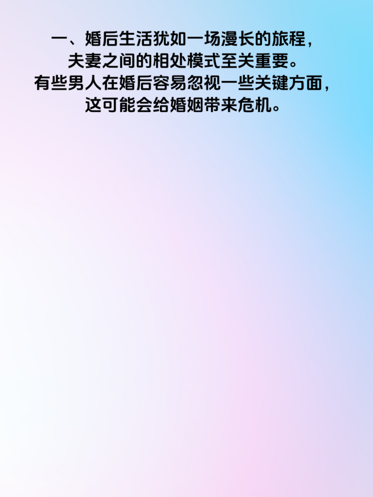 一、婚后生活犹如一场漫长的旅程,夫妻之间的相处模式至关重要。有些男人在婚后容易忽