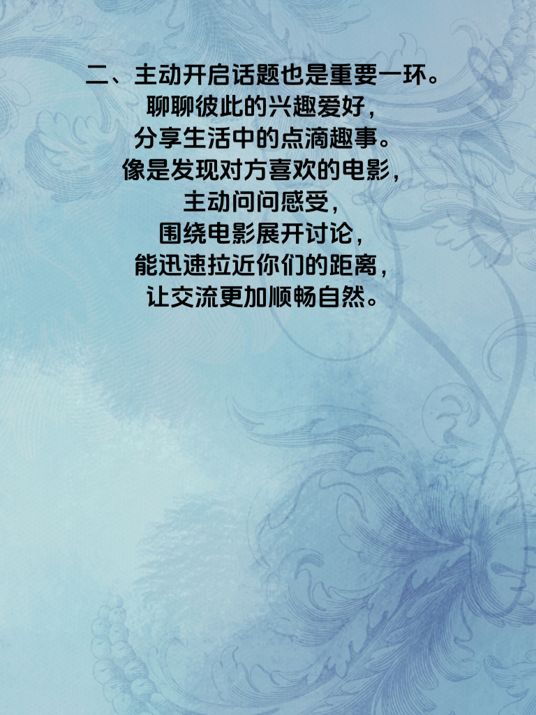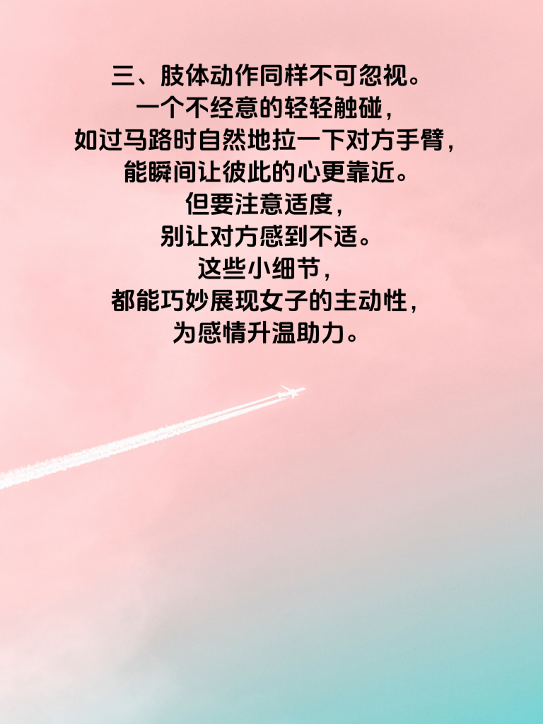 一、在爱情里,女子的主动性往往能为感情增添别样的色彩。而其中一个关键细节,便是眼神交流。当你望向心仪之人时,温柔且专注的眼神会传递出你的好感与真诚。比如,在聚会中偶然对视,不要躲闪,大方微笑,用眼神轻轻诉说你的心意。 二、主动开启话题也是重要一环。聊聊彼此的兴趣爱好,分享生活中的点滴趣事。像是发现对方喜欢的电影,主动问问感受,围绕电影展开讨论,能迅速拉近你们的距离,让交流更加顺畅自然。 三、肢体动作同样不可忽视。一个不经意的轻轻触碰,如过马路时自然地拉一下对方手臂,能瞬间让彼此的心更靠近。但要注意适度,别让对方感到不适。这些小细节,都能巧妙展现女子的主动性,为感情升温助力。