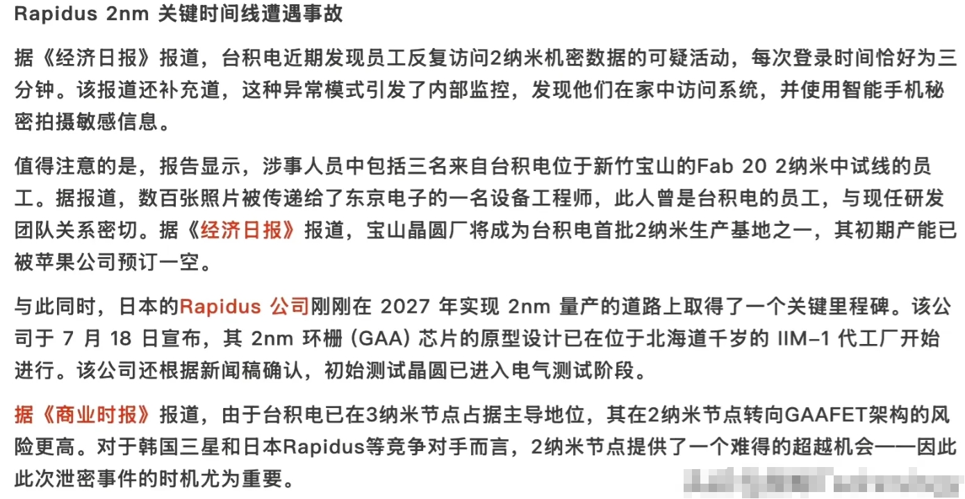 日本Rapidus公司在7月18日宣布突破2nm芯片制程工艺,然后台积电就被爆泄密了。 泄密的人员利用夜班时段,用手机拍摄数百张机密文件(含制程参数、良率数据等),并通过居家办公漏洞绕过厂区安检,而接受方负责人前身也是台积电内部核心的人员,然后跑到日本当小偷去了……