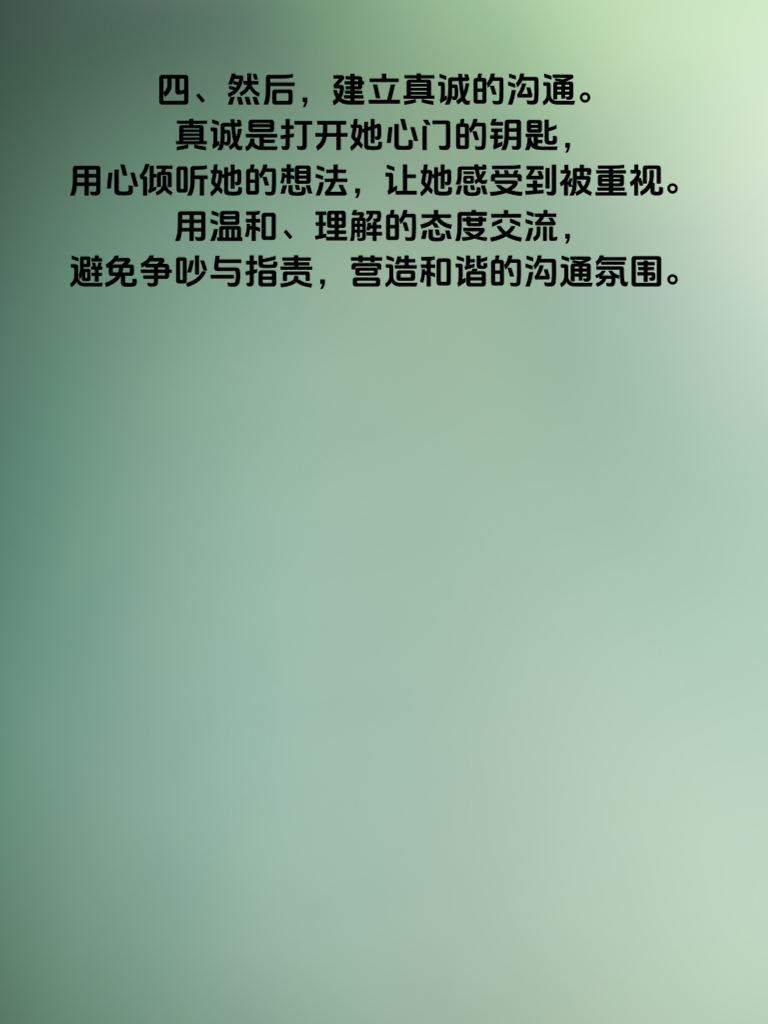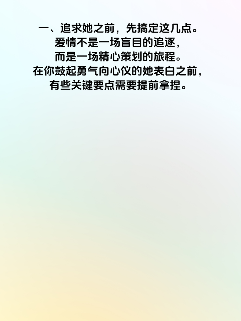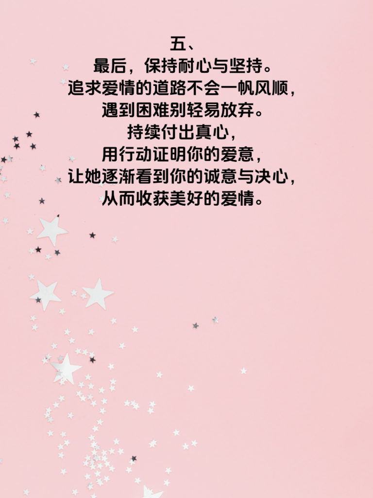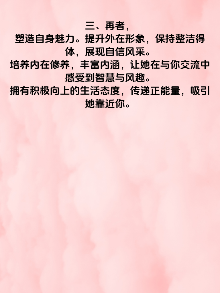 一、追求她之前,先搞定这几点。爱情不是一场盲目的追逐,而是一场精心策划的旅程。在你鼓起勇气向心仪的她表白之前,有些关键要点需要提前拿捏。 二、首先,深入了解她。知晓她的兴趣爱好,才能在相处时有共同话题。比如她爱读书,你就可以聊聊最近读过的好书,分享彼此的感悟。了解她的生活习惯,尊重她的节奏,这样你们的相处才会舒适。 三、再者,塑造自身魅力。提升外在形象,保持整洁得体,展现自信风采。培养内在修养,丰富内涵,让她在与你交流中感受到智慧与风趣。拥有积极向上的生活态度,传递正能量,吸引她靠近你。 四、然后,建立真诚的沟通。真诚是打开她心门的钥匙,用心倾听她的想法,让她感受到被重视。用温和、理解的态度交流,避免争吵与指责,营造和谐的沟通氛围。 五、最后,保持耐心与坚持。追求爱情的道路不会一帆风顺,遇到困难别轻易放弃。持续付出真心,用行动证明你的爱意,让她逐渐看到你的诚意与决心,从而收获美好的爱情。