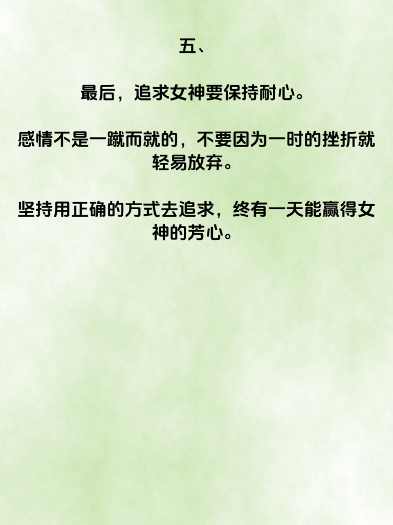 一、追求女神,是一场甜蜜又充满挑战的旅程。在这个过程中,有些雷区一旦踏入,可能就会让你与女神的距离渐行渐远。所以,我们一定要提前了解,巧妙避开。 二、首先,千万别过度纠缠。频繁地给女神发消息,不分场合地打电话,会让她感到压力巨大。每个人都需要自己的空间,给她足够的自由,偶尔恰到好处地关心,才能让她对你保持好感。 三、再者,不要盲目吹嘘自己。真诚才是必杀技,过度夸大自己的成就和能力,很容易被看穿,反而会让女神觉得你不踏实。展现真实的自己,用你的优点和魅力去吸引她。 四、还有,约会时千万不能迟到。这是最基本的礼貌,迟到会给女神留下很不好的印象。提前规划好路线和时间,确保准时出现在她面前,让她感受到你的重视。 五、最后,追求女神要保持耐心。感情不是一蹴而就的,不要因为一时的挫折就轻易放弃。坚持用正确的方式去追求,终有一天能赢得女神的芳心