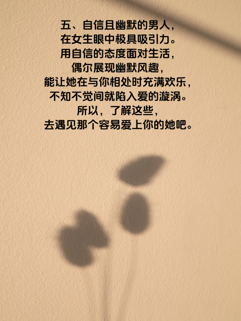 一、男人必知:这些女生最容易爱上你。爱情,是一场奇妙的旅程,而了解女生的心理,能让你在这场旅程中更加顺遂。 二、那些内心善良且富有同情心的女生,往往更容易被温暖所打动。当你在她面前展现出真诚的关怀,对他人的遭遇给予理解和帮助时,她会看到你内心的柔软,从而对你心生好感。 三、热爱生活,积极向上的女生,渴望阳光般的伴侣。如果你也有着对生活的热情,能和她一起探索新事物,分享生活中的点滴美好,她很容易就会被你的活力所吸引,进而爱上你。 四、有自己兴趣爱好的女生,欣赏同样有追求的你。当你专注于自己喜欢的事情,散发出独特的魅力时,她会因你的专注和才华而倾心。 五、自信且幽默的男人,在女生眼中极具吸引力。用自信的态度面对生活,偶尔展现幽默风趣,能让她在与你相处时充满欢乐,不知不觉间就陷入爱的漩涡。所以,了解这些,去遇见那个容易爱上你的她吧。
