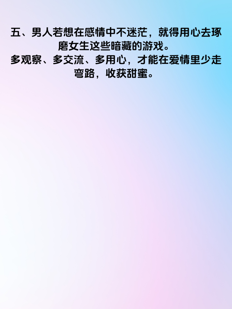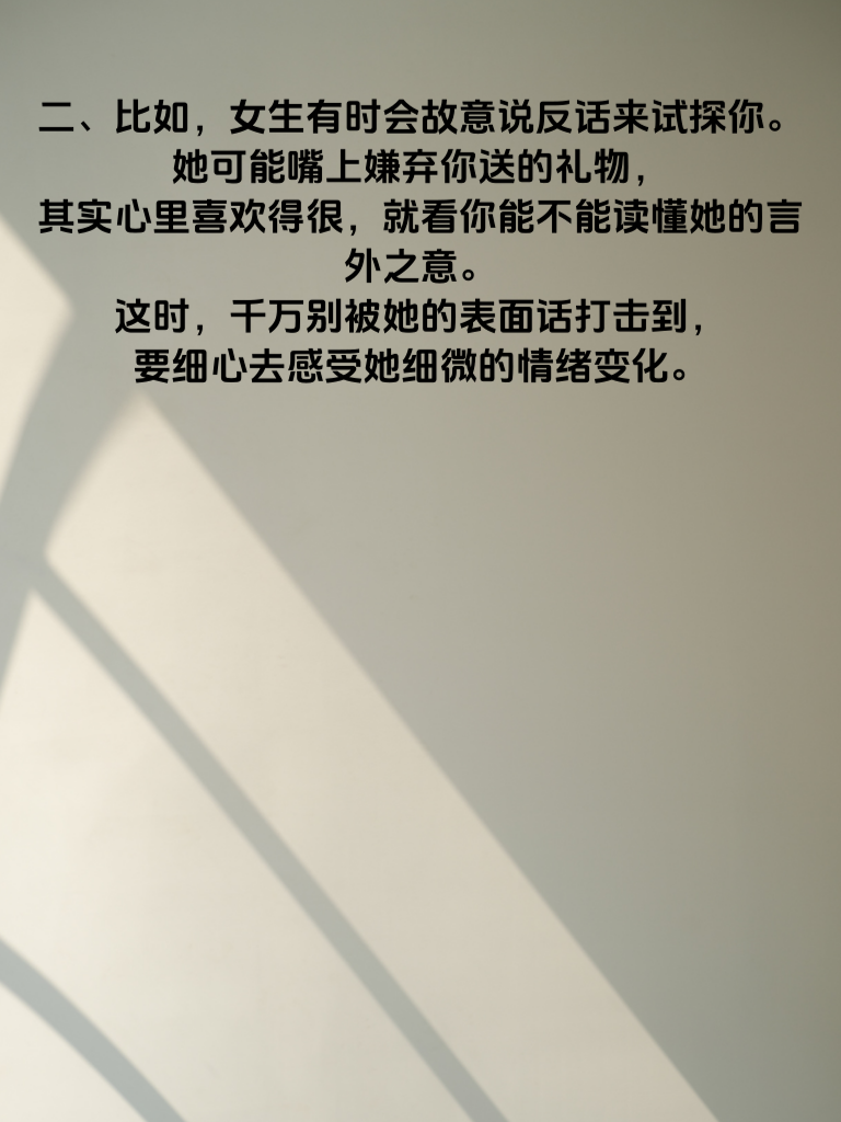 一、在男女情感的微妙世界里,女生常常暗藏着一些心思游戏,而很多男人却浑然不知,结果吃了不少哑巴亏。 二、比如,女生有时会故意说反话来试探你。她可能嘴上嫌弃你送的礼物,其实心里喜欢得很,就看你能不能读懂她的言外之意。这时,千万别被她的表面话打击到,要细心去感受她细微的情绪变化。 三、还有,女生很在意你是否用心记住她的喜好。记住她爱吃的零食、喜欢的颜色,会让她觉得你把她放在心上。若总是忽略这些,她可能会觉得你不够在乎她。 四、另外,她在你面前偶尔的小抱怨,也许并非真的要你解决问题,只是想倾诉和获得你的关心。耐心倾听,适时给些安慰的回应,会让她更依赖你。 五、男人若想在感情中不迷茫,就得用心去琢磨女生这些暗藏的游戏。多观察、多交流、多用心,才能在爱情里少走弯路,收获甜蜜。