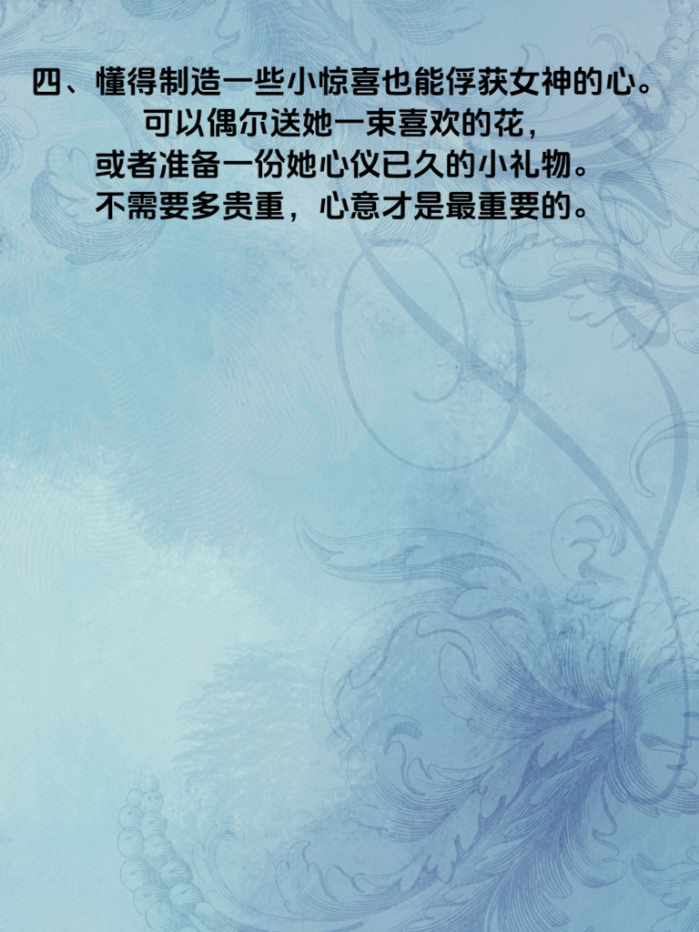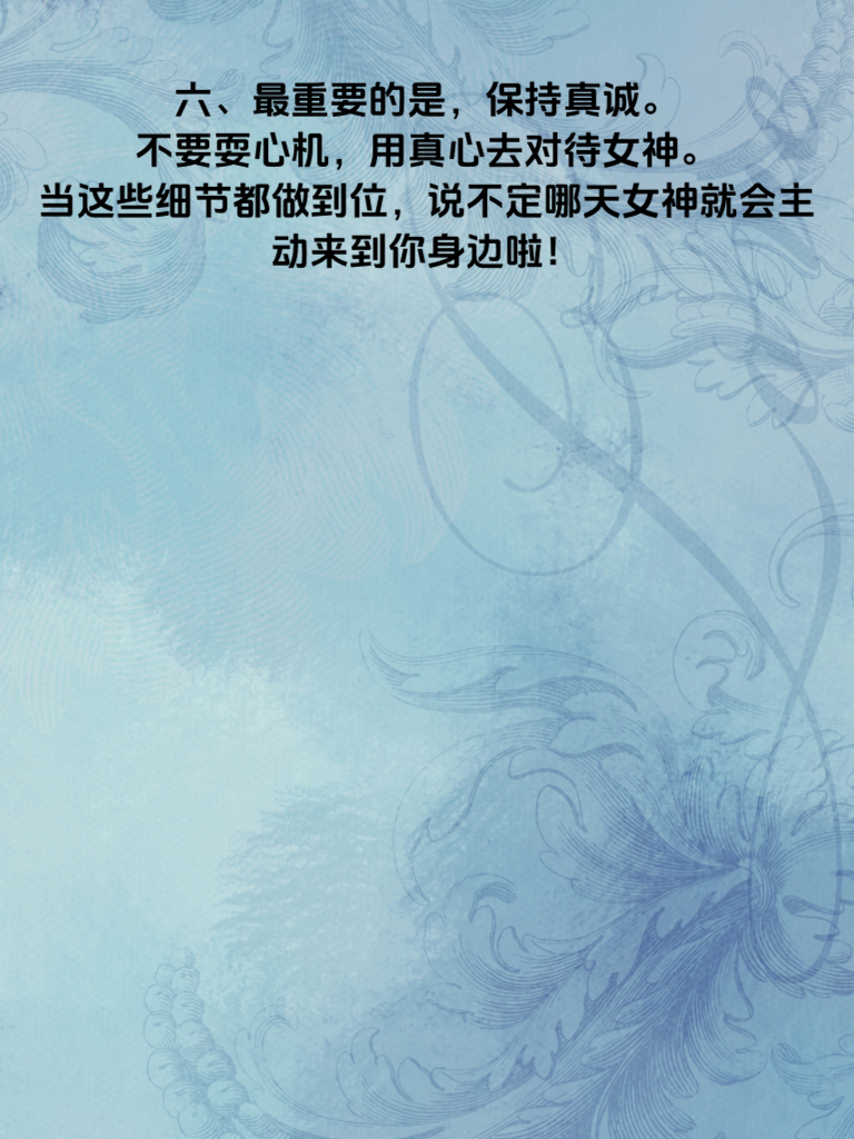 一、男生们,想要让女神主动靠近你吗?其实关键就藏在一些容易被忽略的细节里。 二、首先,注重自身形象是基础。干净整洁的外表,得体的穿着,会让你在女神眼中瞬间加分。保持良好的体态,挺胸抬头,展现出自信的气质。 三、聊天时的细节也至关重要。不要总是围绕自己说个不停,多倾听女神的想法和感受。适时给出真诚的回应和建议,让她感受到你对她的关注。 四、懂得制造一些小惊喜也能俘获女神的心。可以偶尔送她一束喜欢的花,或者准备一份她心仪已久的小礼物。不需要多贵重,心意才是最重要的。 五、还有,要展现出你的上进心和责任心。在工作或学习上努力进取,让她看到你的潜力。遇到问题时,勇敢承担,表现出可靠的一面。 六、最重要的是,保持真诚。不要耍心机,用真心去对待女神。当这些细节都做到位,说不定哪天女神就会主动来到你身边啦!
