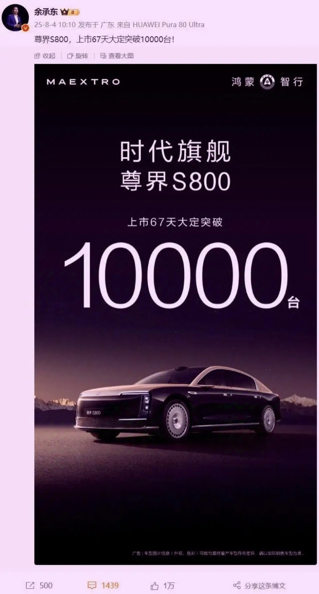 余承东是真够意思!这决策真绝了,还以为他把新款智界1个小时小订10000台以及均价90万尊界S800系列67天大订突破10000台这两个数据拿出来已经是底牌啦!但是当80万台数据出来的时候才明白还是低估了华为的能力!