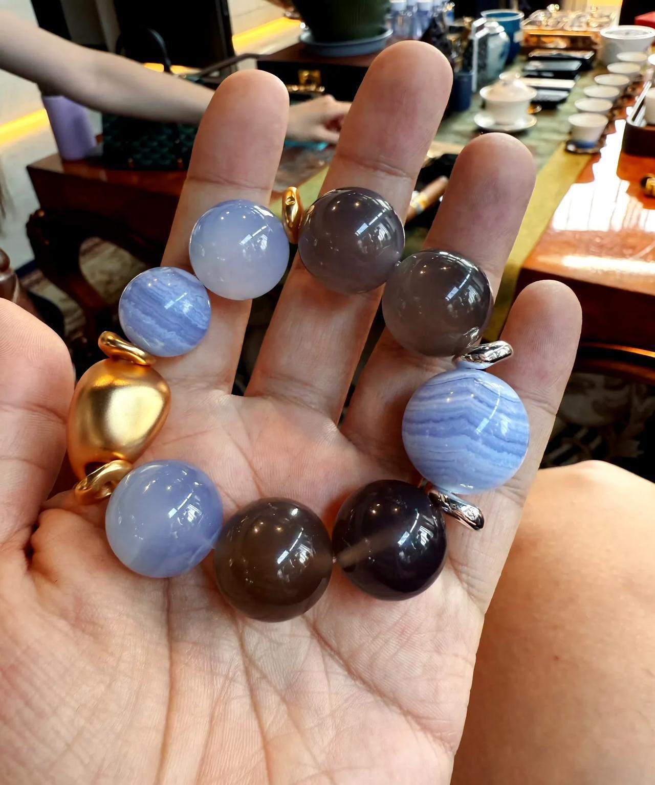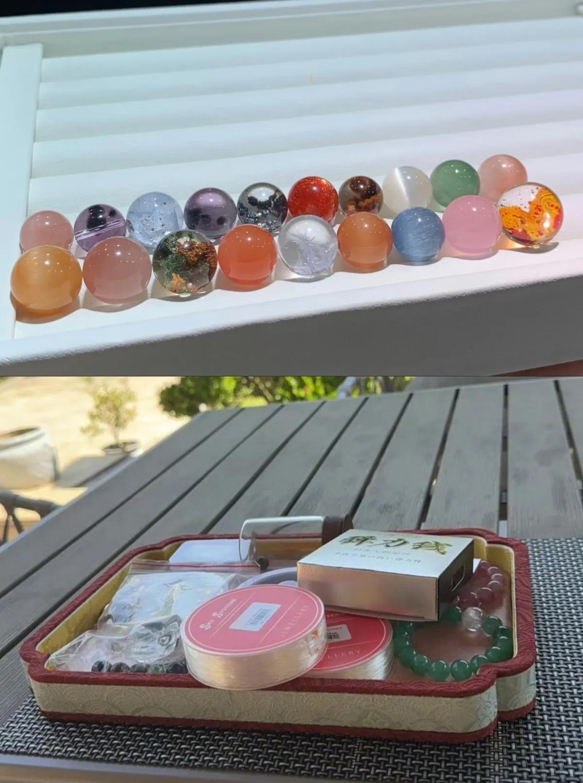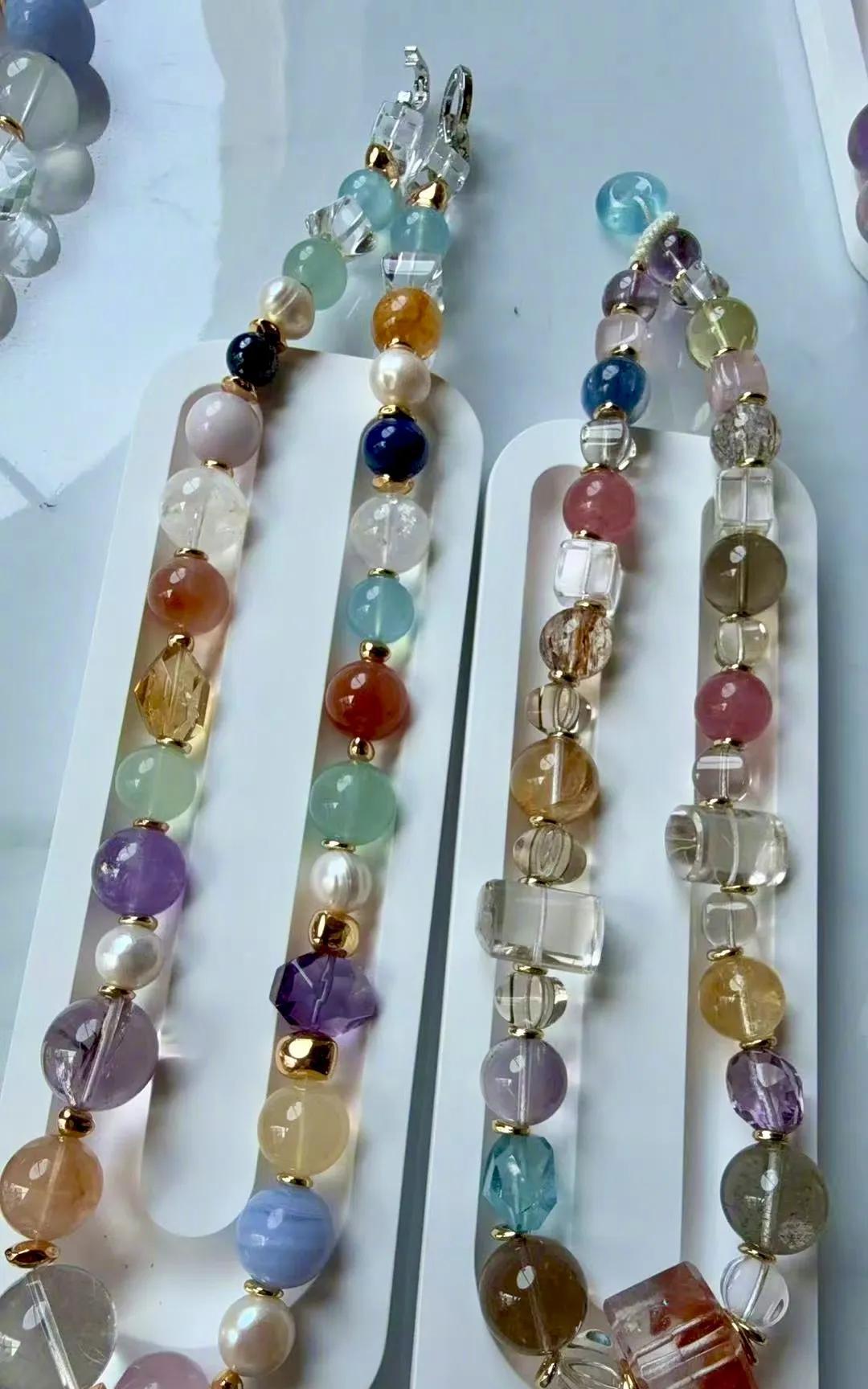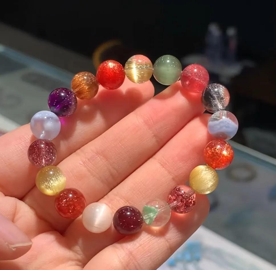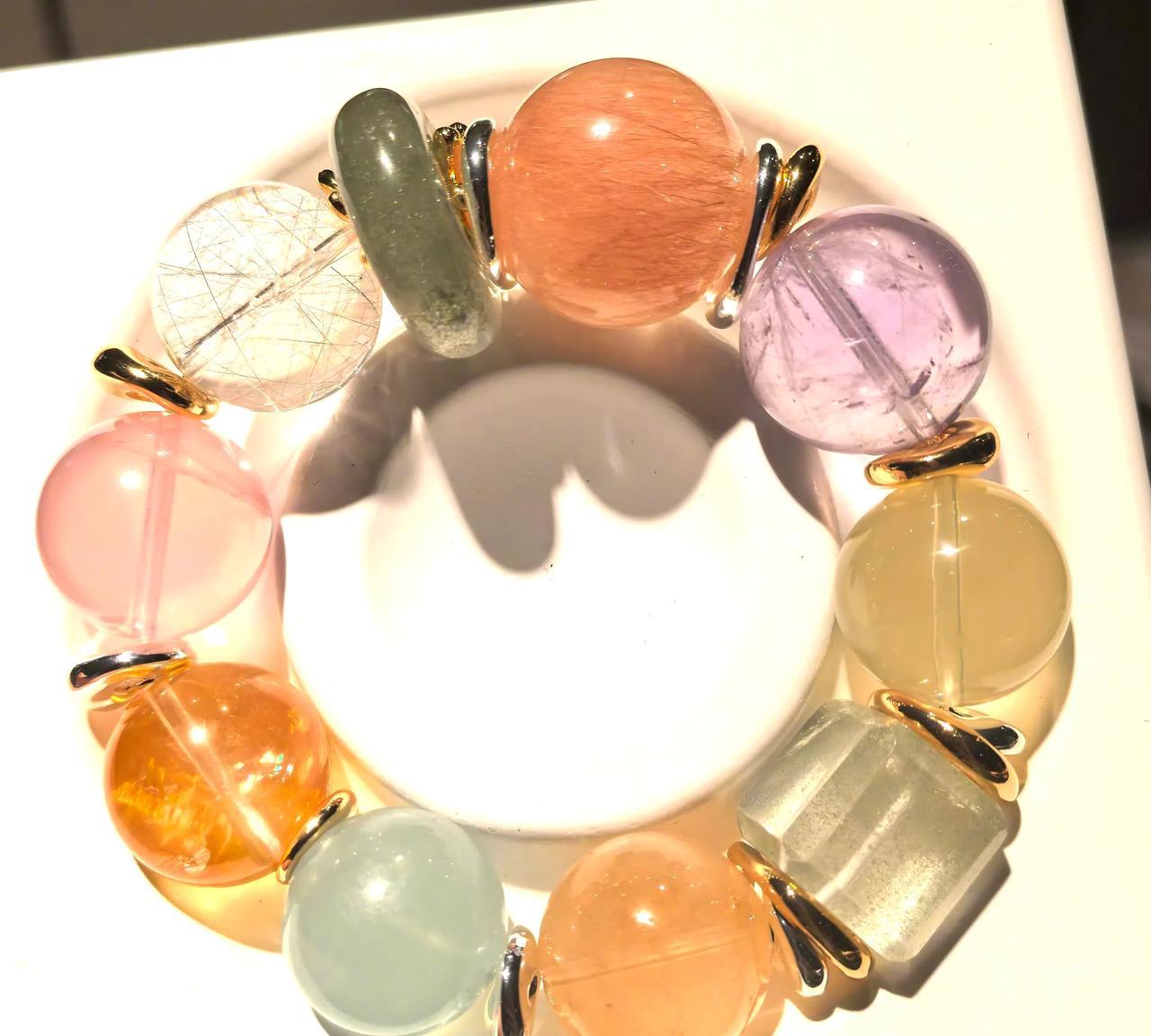 想不到于正还是个水晶顶级玩家呢, 怪不得他一天天的能量充足的很, 原来是有水晶磁场的加持啊。 他这选珠子的眼光,跟选人一样很绝! 看看绿幽灵,金发晶,钛晶,兔毛,超七…… 每一颗都完美无瑕,太诱人了! 他说,这些都是一颗一颗精挑细选回来的, 自己穿完之后,有些会送给旗下的艺人, 代表他的祝福。 如果祝福太多,一种水晶涵盖不了, 那就穿成多宝手串, 这样把所有的美好都串上了。 不得不说, 于正对自己的艺人真是挺有心的!
