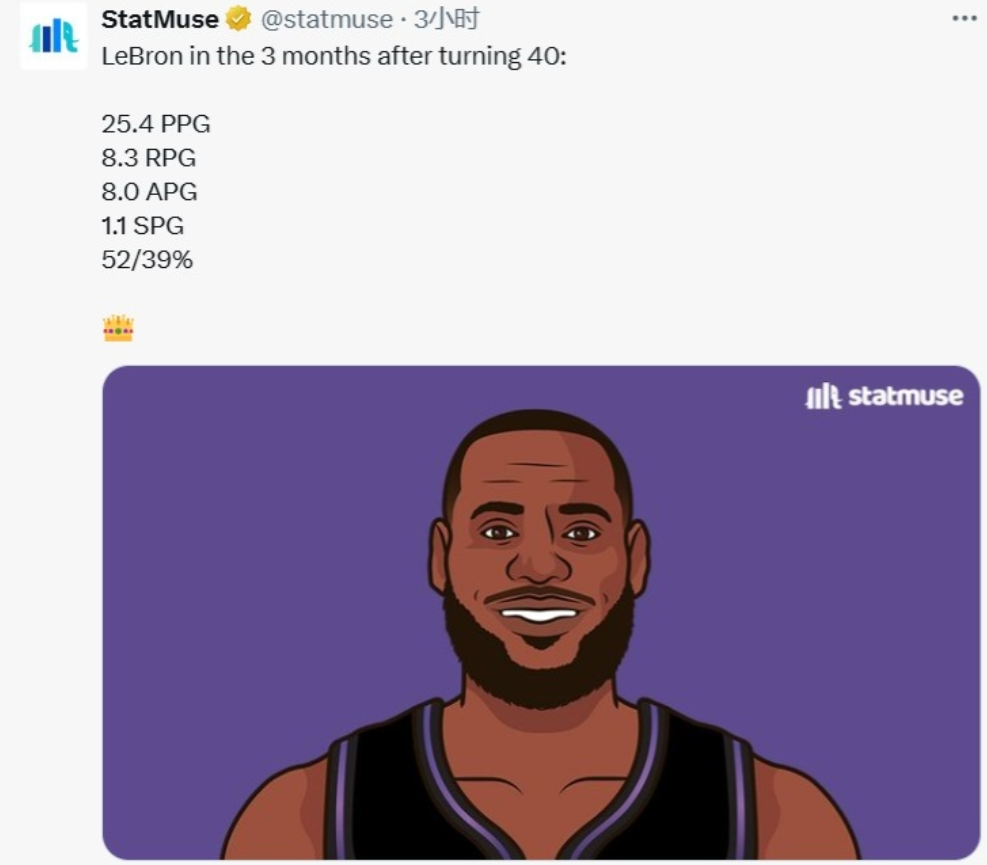 数据媒体StatMuse晒出詹姆斯年满40岁之后3个月的场均数据,并配文:👑。