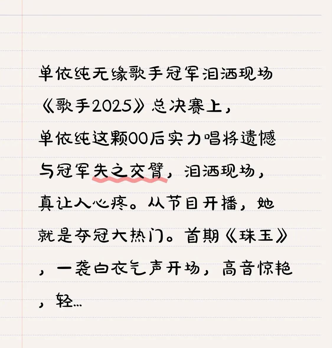 单依纯无缘歌手冠军泪洒现场 在《歌手2025》的总决赛舞台上,00后实力唱将单依纯与冠军之位擦肩而过,无缘冠军的她在现场泪如雨下,那模样真叫人心疼不已。 自打节目开播起,单依纯就被视作夺冠的热门人选。在首期演唱《珠玉》时,她身着一袭白衣,用气声开启演唱,那高音一出,惊艳全场,轻而易举地就将周冠军收入囊中。而在翻唱《天空》的时候,在无修音的直播状况下,她稳定发挥,哭腔和甩腔的运用堪称绝妙,就这样顺利实现两连冠,简直就是“新生代歌手中一颗耀眼的明星”。 总决赛里,她邀请王力宏前来助阵,演唱时的表现依然非常稳定。可是总决赛竞争极为激烈,最后她只获得了第三名。当结果公布的那一刻,她眼中的失落与不甘瞬间化作泪水,这一场景很快就登上了热搜。粉丝们纷纷送上安慰,毕竟大家心里都清楚,她的实力是非常强劲的,一次比赛的结果说明不了什么,在未来她必定能够绽放出耀眼的光芒! #单依纯# #单依纯翻唱歌曲# #歌手单依纯# #单依纯写真# #单依纯即兴创作#