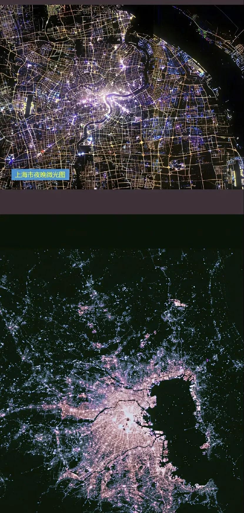 这是全球两个超大城市上海和东京的夜景灯光图,上海的夜景灯光主要集中在黄浦江一带,