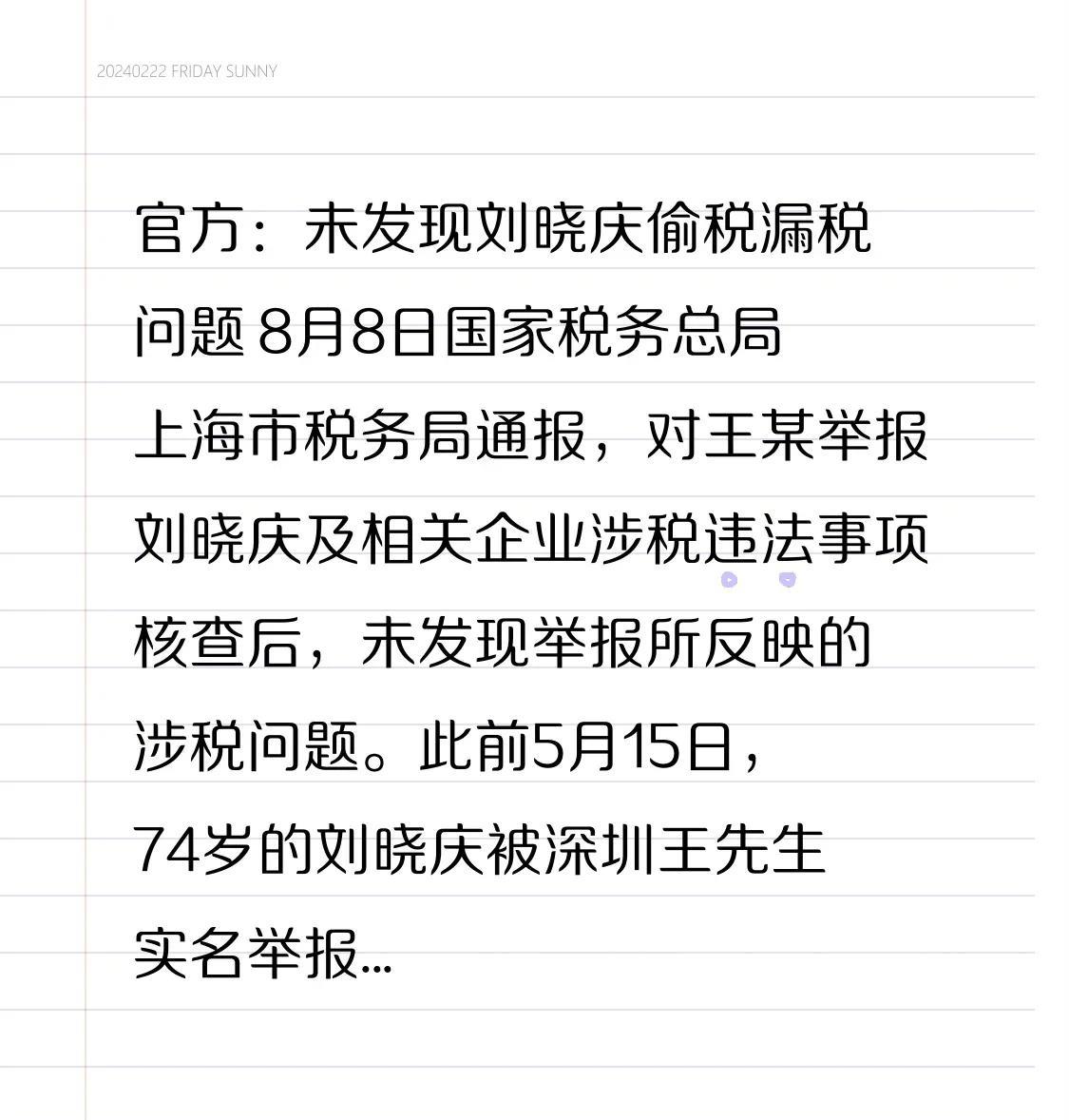 8月8日,国家税务总局上海市税务局发布通报,针对王某举报刘晓庆及其相关企业涉税违