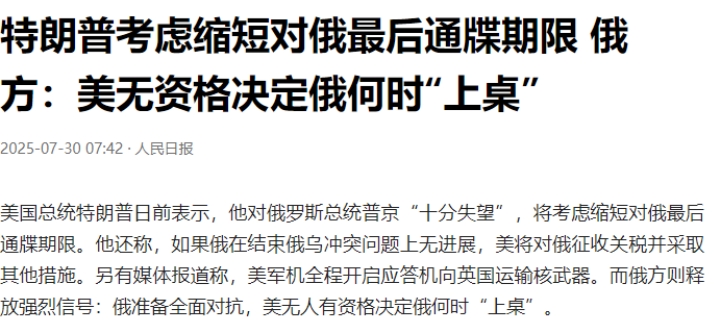 特朗普已经接连两次向俄罗斯发出通牒,态度强硬地要求俄罗斯尽快和乌克兰达成协议。更引人注目的是,他给出的时限从第一次的50天内,急剧缩减至10到12天。这样大幅度缩短的期限,无疑显示出特朗普对于俄乌冲突解决的急切心态,同时也表明他对俄罗斯在推动和平进程上的缓慢进展极为不耐烦。