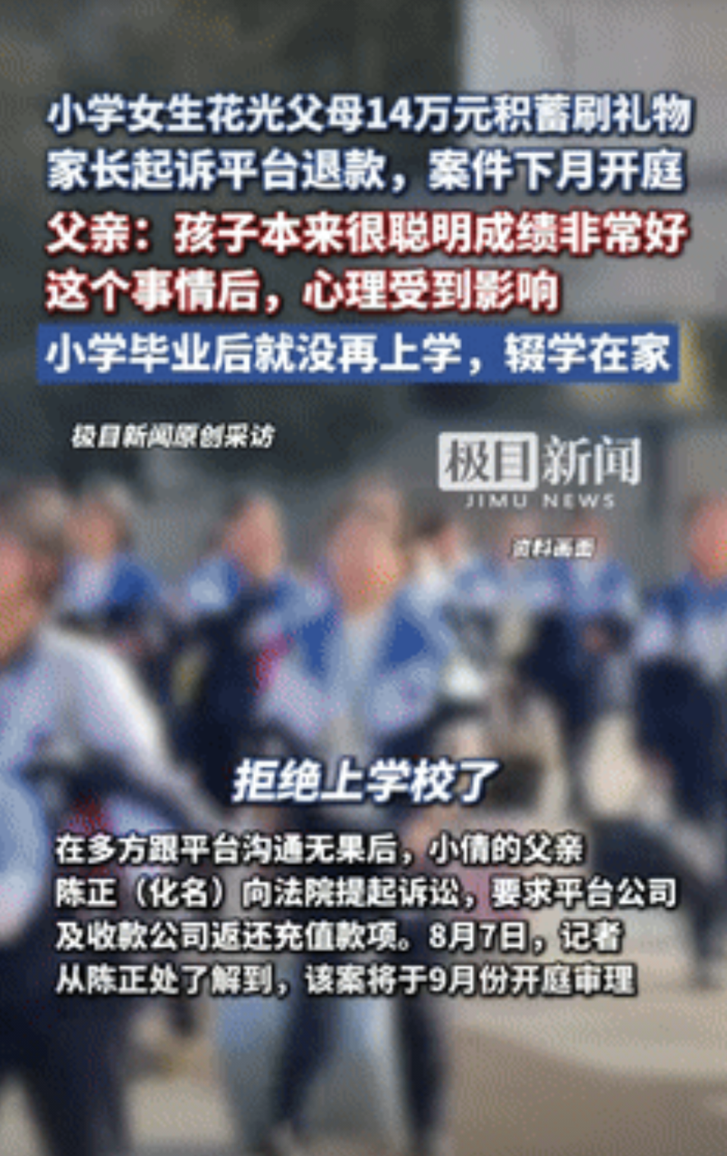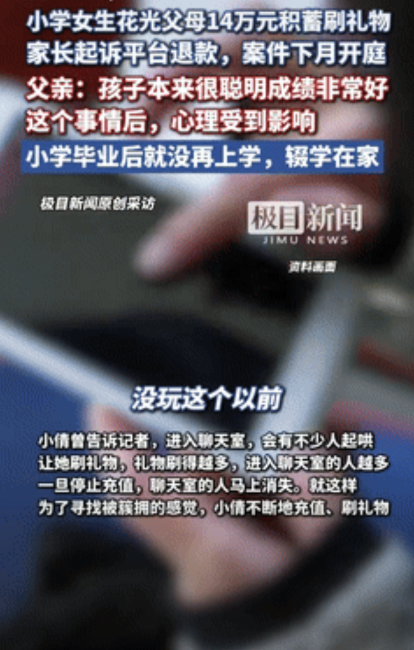 “胆子不是一般大!”河北保定,一小学女孩因在班级受到同学冷落,就想到虚拟世界寻求安慰,短短5个月,女孩就在交友软件打赏了14万元,耗尽家中积蓄,父母得知后,联系平台退钱,没想到,竟遭到对方各种推脱,气的女孩父亲将其告上法庭! “这可都是我们的血汗钱啊,这不退今后我们可怎么活啊!”父母哭诉着说道,河北保定一个普通家庭里,六年级学生小倩的父母对着手机屏幕反复哀求,却只换来平台客服冰冷的“已登记反馈”。 2024年初,12岁的小倩还是保定某小学六年级的学生,原本活泼的她因性格内向逐渐被班级小团体边缘化,同学课间嬉笑打闹时,她总是一个人坐在角落,分组活动时,她的名字永远被最后念到,这种持续的冷落像细密的针,扎进了孩子敏感的心里。 一次偶然的机会,她在手机应用商店里下载了“觅光”APP,这款打着“轻松交友、治愈孤独”旗号的软件,成了她逃离现实的避风港,注册后她立刻被五花八门的聊天室吸引——只要进入房间,立刻会有人热情地喊她“小妹妹”,甚至有人主动发来“虚拟拥抱”的表情包。 起初小倩只是默默围观其他用户的互动,但很快,她发现那些收到礼物的“主播”会获得更多关注,一次她用父亲微信里零钱里的5块钱买了朵“玫瑰”,屏幕上立刻弹出“小倩送给主播一朵玫瑰”的特效,主播笑着对她说:“谢谢小倩,真是个可爱的小天使!”这句简单的夸赞,让她第一次感受到了被重视的滋味。 虚拟世界的“认可”像毒品一样让小倩上瘾,她开始频繁登录“觅光”,每天放学后第一件事就是躲进房间打开APP,聊天室里,总有用户起哄:“小倩,刷个‘火箭’呗,主播给你唱歌!”“你这么有钱,怎么不送个‘游艇’给大家看看?”在这些怂恿下,她的打赏金额从几元、几十元,迅速攀升到几百、上千元。 为了支付这些费用,小倩偷偷记住了父亲陈正的手机支付密码,陈正是个货车司机,妻子在超市打工,14万元是两人十年省吃俭用攒下的积蓄。 原本计划用来给小倩上初中和应对突发状况,他们从未想过,手机里零散转出的“小额支出”,竟会汇成一笔巨款,就这样,在5个月里,小倩通过200多笔交易,将14万元全部打赏殆尽。 直到2024年6月陈正需要用钱给货车交保险,才发现银行卡余额只剩37元,查询交易记录后,他几乎昏厥——密密麻麻的支付记录里,“觅光平台充值”占了绝大多数,面对父母的质问,小倩跪在地上哭着说出了真相。 愤怒又绝望的陈正立刻联系“觅光”平台客服,对方最初态度积极,表示“会核实情况”,但随后便以“用户自愿打赏”“无法证明是未成年人操作”为由推脱,陈正提供了小倩的出生证明、学籍信息,甚至打印了聊天室里其他用户怂恿未成年人消费的截图,但平台始终以“需要进一步调查”拖延。 ”陈正的妻子哭着说,多次沟通无果后,这个老实巴交的司机做出了一个大胆的决定:起诉平台,他向保定当地法院提交了诉状,要求平台返还全部打赏款项,但平台也是坚决不退。 此事曝光后引发了全网热议,有网友愤怒地表示:“平台明知未成年人容易沉迷,却不设任何有效防护,这和向孩子贩毒有什么区别?必须重罚,才能让这些资本家长记性!” 另一位网友则表示:“校园冷落是诱因,但家庭教育的缺失也不容忽视,现在很多父母把手机当‘电子保姆’,孩子遇到问题不跟家长说,反而去网上找安慰,这起案件该警醒所有家长——陪伴和沟通,比什么都重要。” 14万元积蓄化为乌有,一个女孩的童年蒙上阴影,一个家庭陷入困境,这场由虚拟“温暖”引发的悲剧,撕开了网络平台监管的漏洞,也敲响了未成年人网络保护的警钟,当法律的天平即将落下判决,人们更期待的是:这样的故事,永远不要再重演。 对此你怎么看?欢迎大家在评论区留言讨论。