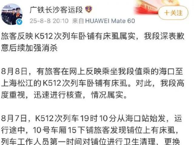 几个小虫子竟然折腾了一个晚上!8月7日晚,乘客李女士拖着行李箱登上K512次列车,本以为8小时的夜间行车能让她好好休息,没想到被几只小小的虫子,搅闹的一晚上没睡,评论区不少网友都表示也有类似经历。铁路部门回应:将加强车厢消杀工作。 8月7日晚上,李女士登上k512次列车,准备回家。她订了一张卧铺,就是想趁着晚上,能在火车上休息一下。 李女士躺下以后,就感觉枕头下面好像有什么在动,她赶紧掀开枕头,当时就吓了一大跳。枕头下面竟然有几只小虫子在爬来爬去! 通过手机搜索比对,李女士确认这些不速之客是臭名昭著的床虱,一种繁殖力很强、难以完全消杀的小虫子。 不仅仅是李女士,相邻铺位的三位乘客也陆续发现虫迹。他们向工作人员反映之后,列车员迅速赶来更换床品。 但没过多久,床单缝隙间又钻出几只床虱。 这下子李女士彻底睡不着了,都知道床虱难以被完全消灭,而且几个铺位都发现了,李女士估计自己附近的床虱问题应该挺严重的。 尽管乘务员提出再次更换铺位,考虑自己到即将到站,她选择婉拒列车员的提议。 这场意外让李女士彻夜未眠。 次日清晨,当她向列车方申请退票补偿时,被乘务员拒绝,乘务员表示目前对于列车上的虫子问题,还没有相关规定,乘务员没有相关的权限。 乘务员也对此感到抱歉,于是请李女士吃早餐作为补偿,同时也承诺会进行除虫行动。 工作人员解释称,每趟列车终到后都有标准化清洁流程,但中途站点受停靠时间限制,通常只能做基础整理。 李女士表示不能接受,如果有标准流程的话,为什么还会有虫子? 所幸,这次遭遇没有什么不好的影响,李女士事后去检查身体也并无大碍,不过是身上有些痒罢了。 李女士表示,把这次事件发出来也不是为了追责,不过是为了提醒大家注意和防范这种事情。 至于李女士自己?她表示,以后可能会选择硬座出行了。 中国铁路12306的客服后来对询问此事的人表示:每趟列车完成行程后,都有专门工作人员对卧铺床单进行更换清洁,并对车厢进行消杀。 但由于中途站点停车时间短,一般来讲只能由工作人员对卧铺床位进行整理。 该客服表示,若遇到此类情况,可联系乘务员,车厢内备有杀虫剂,若列车车厢有备用床单,也可向乘务员申请更换。 此外,客服称会登记上报此事,后续将加强车厢内的消杀工作。 对此,评论区有从事列车消杀的网友现身说法:整个床铺包括铁管,床边缝隙都要消杀氯氰菊酯乳油或者用列喜镇全面消杀。 而床虱很可能是某位旅客身上带下来的,中途到站这点时间根本无法全面消杀。 但是,也有其他网友不太买账,表示:7月22日乘坐z114海口到哈尔滨14车9下铺10下铺,卧铺好多臭虫,身上叫虫子咬了,四肢都是红疙瘩。 到家后去救治,打了一个星期的点滴,今天是8月8日身上还有红印,希望铁路部门重视,作好消杀,给旅客一个安全快乐的出行。 根据《消费者权益保护法》第七条和第十八条,经营者(包括铁路运输企业)需保障消费者人身、财产安全,提供的服务应符合安全标准。具体到铁路运输领域, 列车作为公共场所,铁路部门需确保车厢内无害虫滋生,定期进行消杀工作。 本事件中,旅客发现床虱后,乘务员仅更换床单但未彻底消杀,导致虫害持续存在,表明铁路部门未尽到基本卫生管理责任。 在旅客提出退票诉求被拒,但根据《铁路法》第十二条,若因铁路方责任导致旅客无法正常使用服务,应退票或补偿。 本案中,铁路部门仅以早餐致歉,未实质性解决旅客权益受损问题,可能构成违约。 同时,根据根据《列车卫生管理制度》,铁路部门需对卧铺床单执行“一客一换”并定期消杀车厢。 但事件显示,中途站点因时间限制仅简单整理床铺,未彻底处理虫害隐患,暴露管理漏洞。 对于此事,你有什么看法呢? #头号创作者激励计划#