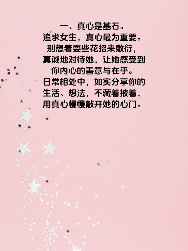 一、真心是基石。追求女生,真心最为重要。别想着耍些花招来敷衍,真诚地对待她,让她感受到你内心的善意与在乎。日常相处中,如实分享你的生活、想法,不藏着掖着,用真心慢慢敲开她的心门。 二、了解她的喜好。用心去探寻她的兴趣爱好,这会成为你们之间很好的话题切入点。知道她爱看书,就聊聊最近读的好书;晓得她喜欢运动,不妨约她一起挥洒汗水。投其所好,能迅速拉近你们的距离。 三、注重细节。生活中的点滴细节最能打动女生。记住她的生日、喜好的颜色,在特殊日子送上贴心小礼物。约会时为她拉椅子、开车门,这些不经意的举动,会让她觉得备受呵护。 四、保持适当距离。别一味地黏人,给彼此都留些空间。让她有自己的朋友圈子和个人时间,这样她会更珍惜和你在一起的时光,也能让她看到你的独立与自信。 五、展现你的上进心。女生都希望另一半有追求、有目标。努力工作,为自己的未来拼搏,让她看到你的潜力和对生活积极的态度,她会对你更有好感。做到这些,征服她的心也就不远啦。